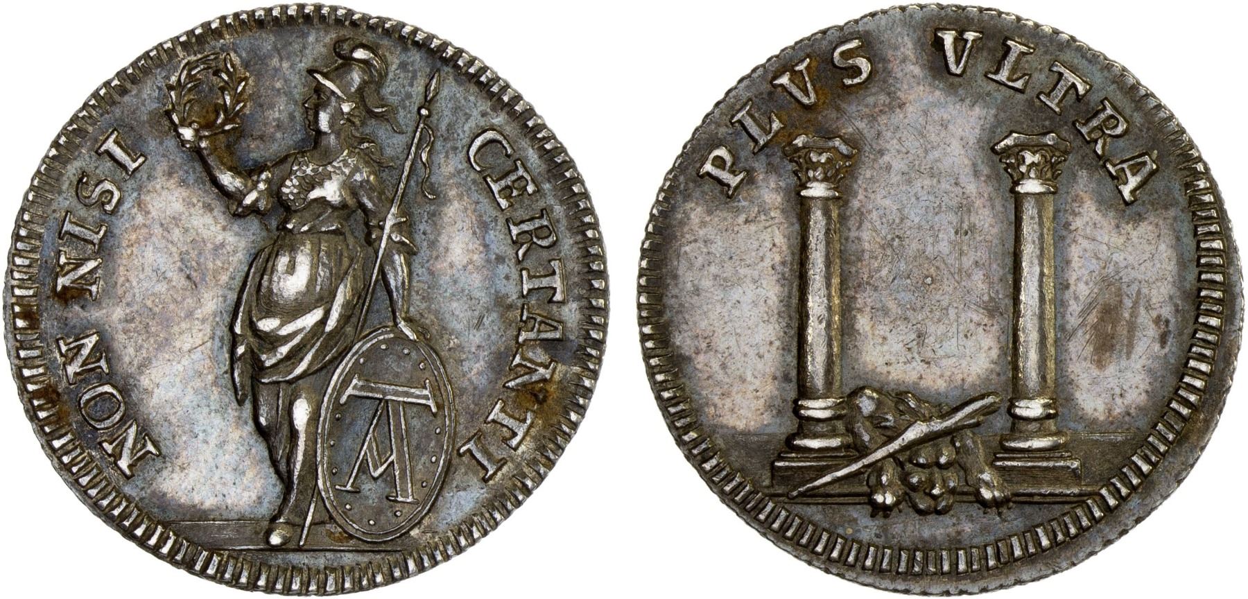 ULM: Free Imperial City, AR medalete (2.79g), Nau-214, Forster-207, 20mm silver School Prize medalete, struck circa 1712; NON NISI CERTANTI, standing peace with olive branch and shield // PLUS ULTRA over two pillars with defeated beast between, one cleaned and now retoned nicely, AU.