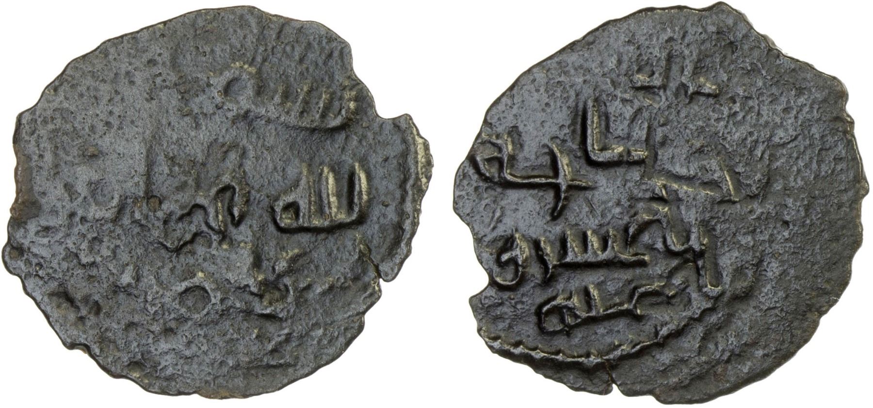 UMAYYAD: AE fals (0.83g), al-Juzjan, AH11x, A-J203, citing the governor 'âmir bin 'ubayda on the obverse, mint & date on the reverse, date perhaps AH112 but the final digit is not sufficiently clear; 2nd known specimen (first sold in our Auction 53, lot 165), partially double-struck, crude VF-XF. There was an official named 'Amir b. 'Ubayda al-Bâhili, who served as the chief judge at Basra AH120-126, but we have found no evidence that this judge might have earlier been a governor in Khurasan.