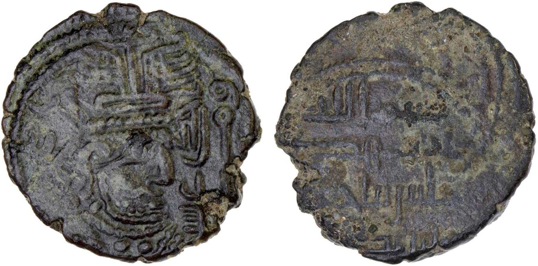 UMAYYAD: AE fals (1.49g), Balkh, AH111, A-U197, Gyselen-95, Sasanian-style bust right, date in words to the right // Arabic legend bism Allah / duriba hadha / al-fals bi-balkh / sittin bi-dirham / ja'iz, thus valued at "sixty to the dirham", choice VF, RRR.