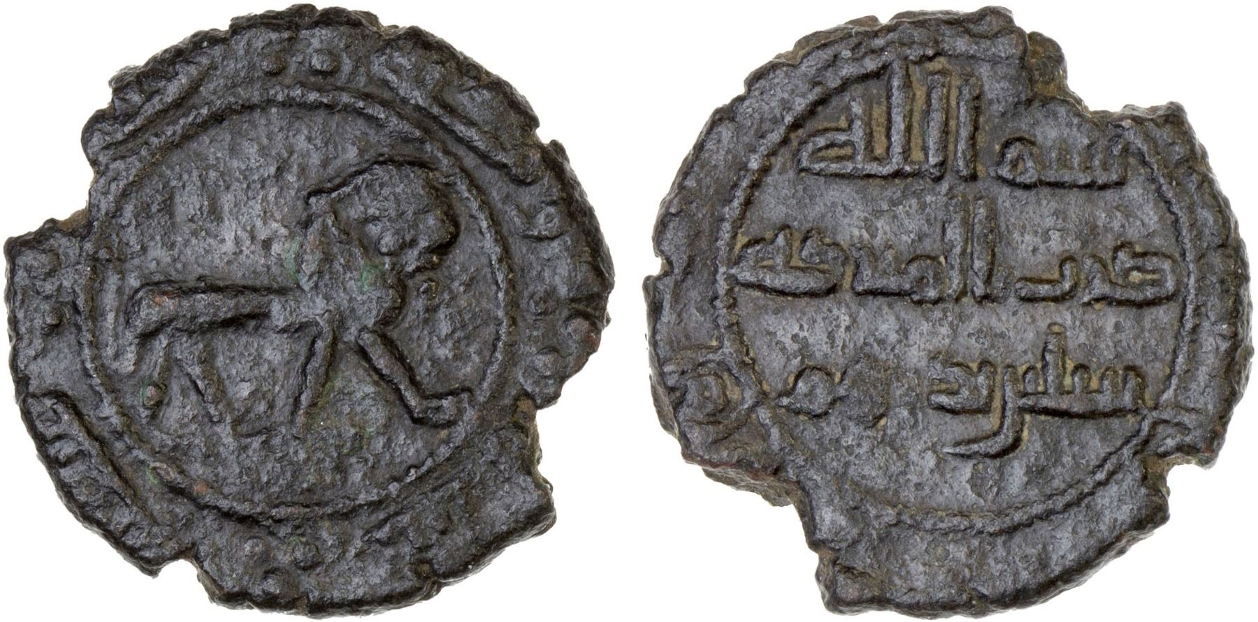 UMAYYAD: AE fals (1.88g), al-Mubaraka (= Balkh), AH117, A-C204.1, lion in obverse center, date formula around // mint and denomination as sittin bi-dirham ("60 to a dirham"); date sufficiently clear, VF, RR.