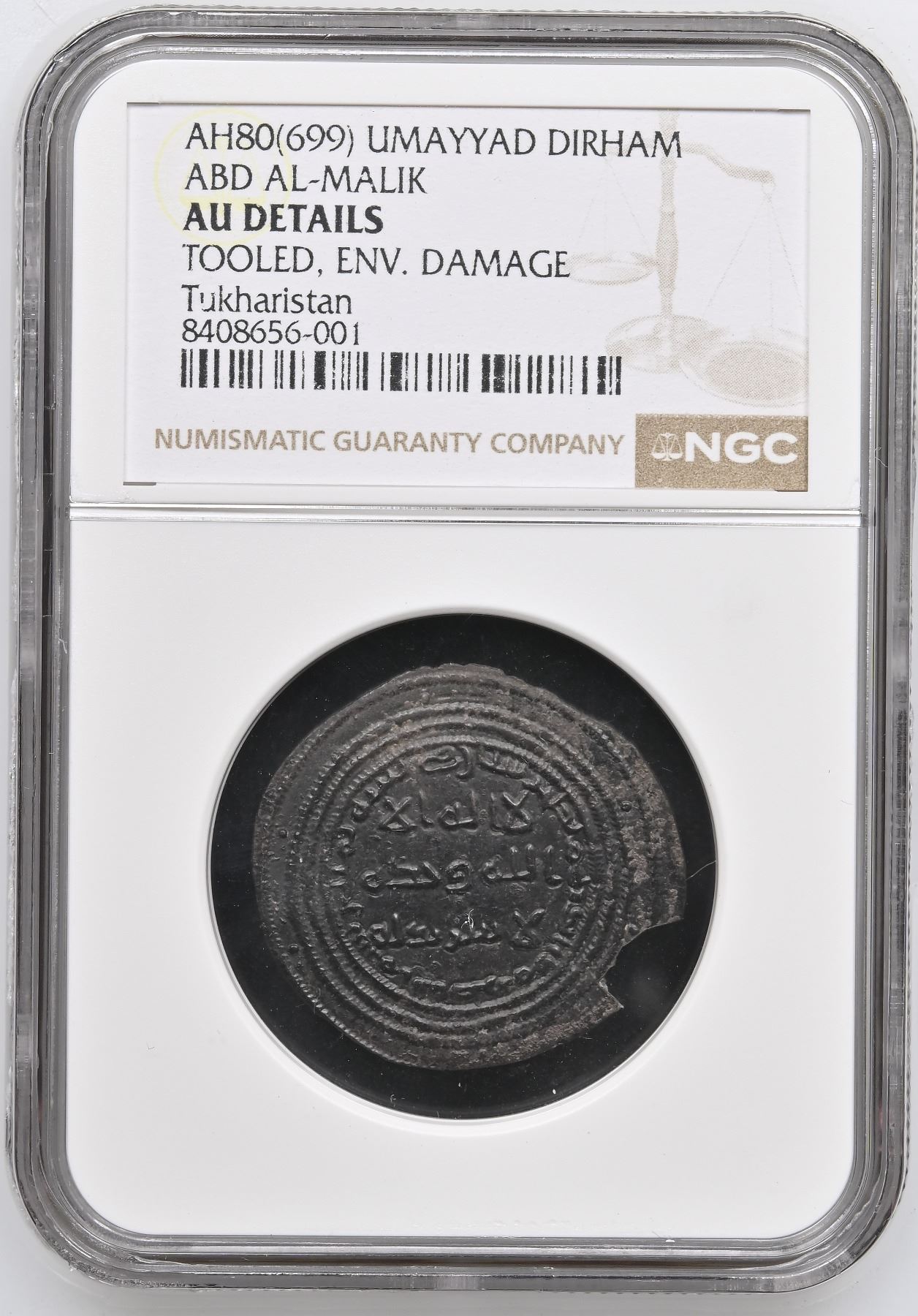 UMAYYAD: 'Abd al-Malik, 685-705, AR dirham (2.64g), Tukharistan, AH80, A-126, Klat-, third known example for the Umayyad mint of Tukharistan, located east of Balkh, on both the Afghan and Tajikistan sides of the Amu Darya river, much of it within Umayyad control by about AH77; the actual location of the mint is unknown, but the calligraphic style unique to this mint and nearly Balkh in the early AH80s; dark surfaces, one small chip, tooled, environmental damage, NGC graded AU details, RRRR
