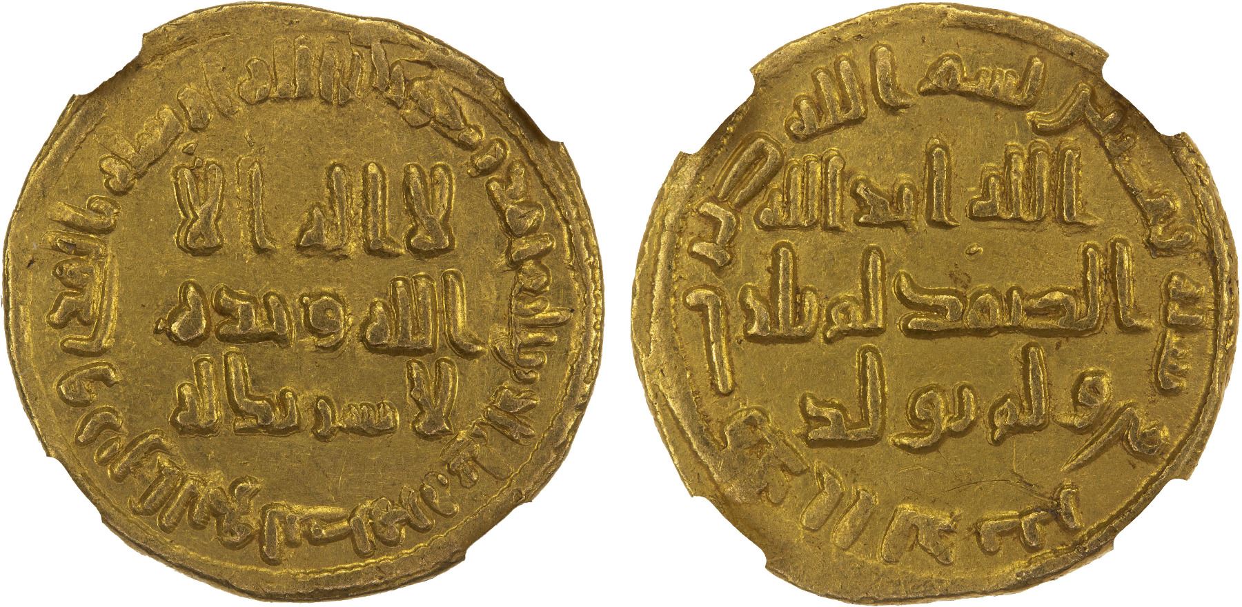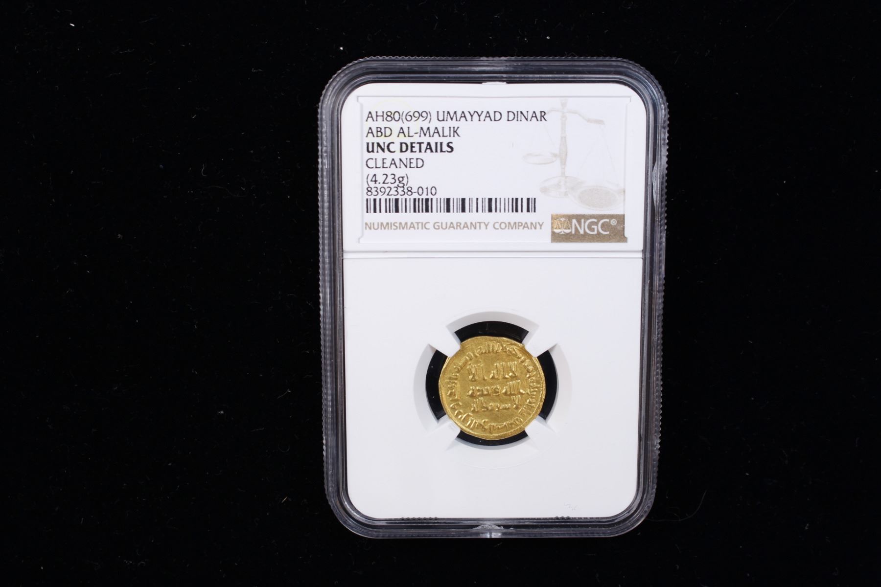 UMAYYAD: 'Abd al-Malik, 685-705, AV dinar (4.23g), NM (Dimashq), AH80, A-125, very light cleaning, NGC graded UNC details.