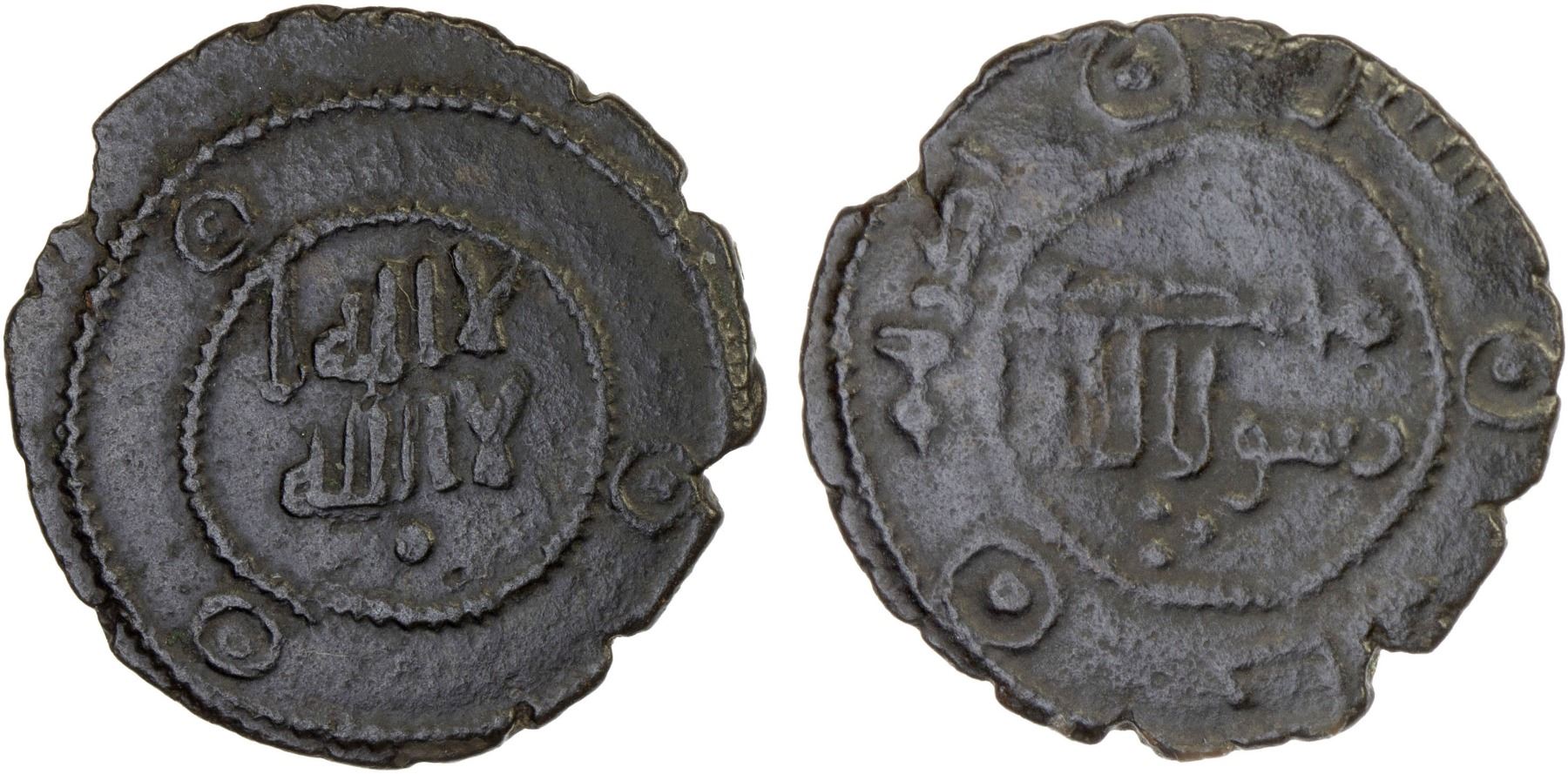 UMAYYAD: Anonymous, ca. AH110-120, AE fals (1.94g), NM, ND, A-J206, with the kalima divided between the obverse & reverse central circles, with 3 annulets in the broad margin on each side and the phrase sittin / bi-dirham / ja'iz in the reverse margin; wonderful strike with no weakness, VF-XF, RR.