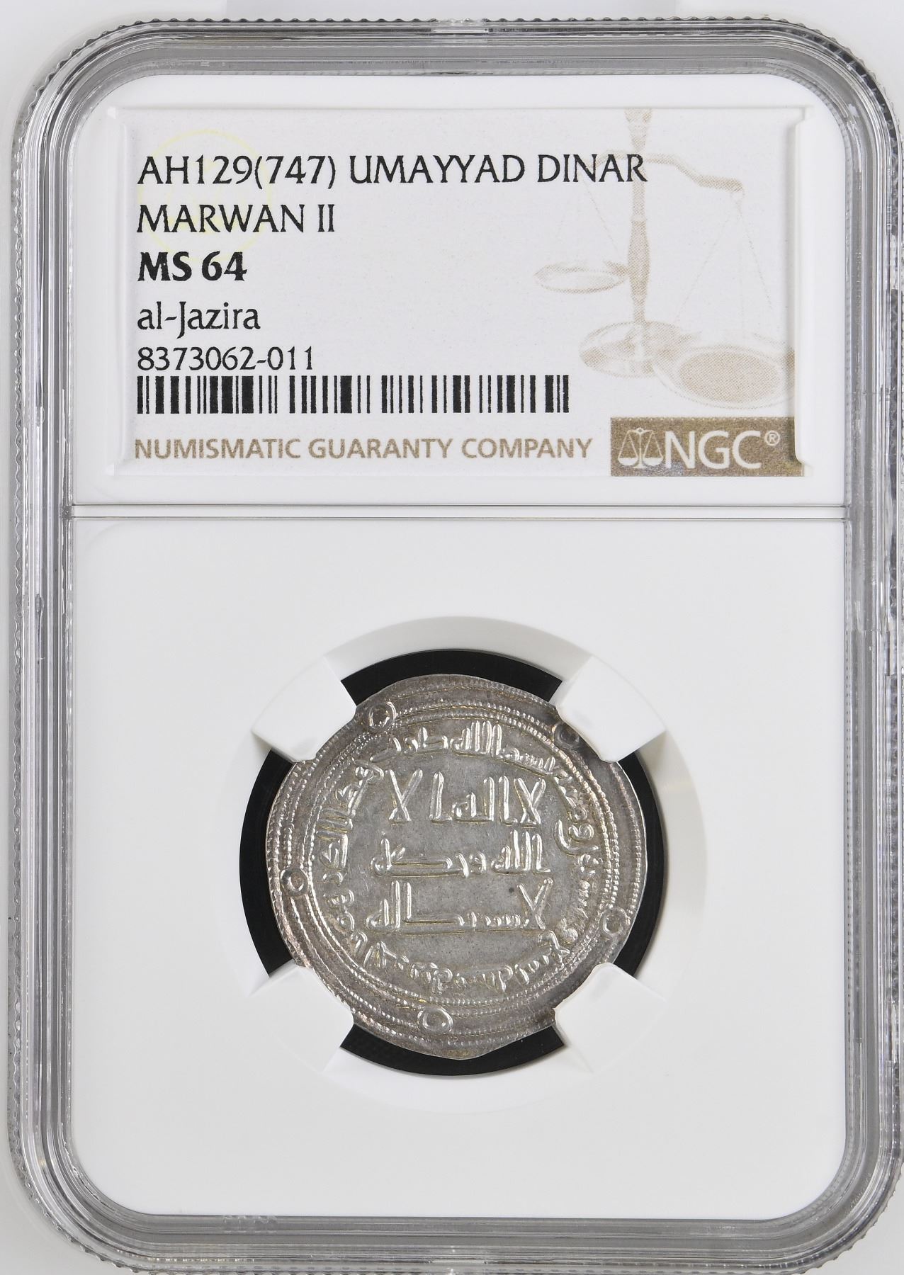 UMAYYAD: Marwan II, 744-750, AR dirham (2.90g), al-Jazira, AH129, A-142, Klat-225, fabulous strike, with much luster, NGC graded MS64.