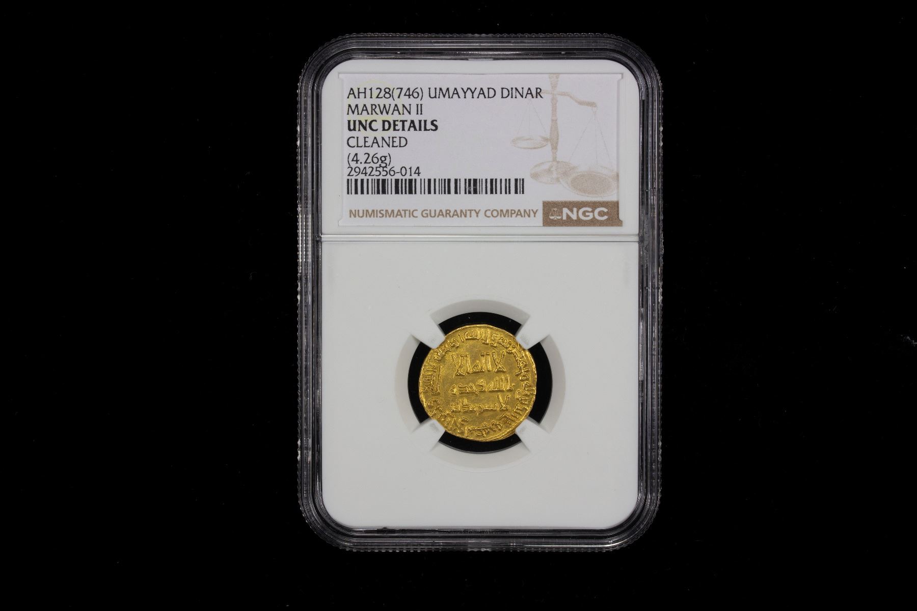 UMAYYAD: Marwan II, 744-750, AV dinar (4.26g), NM (Dimashq), AH128, A-141, superb strike, very lightly cleaned, NGC graded UNC details.