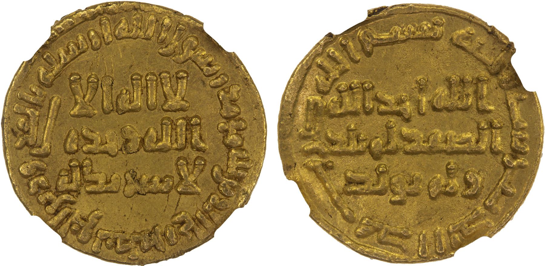 UMAYYAD: 'Umar, 717-720, AV dinar (4.25g), NM (Dimashq), AH100, A-132, obverse graffiti, damaged according to the holder, NGC graded UNC details.