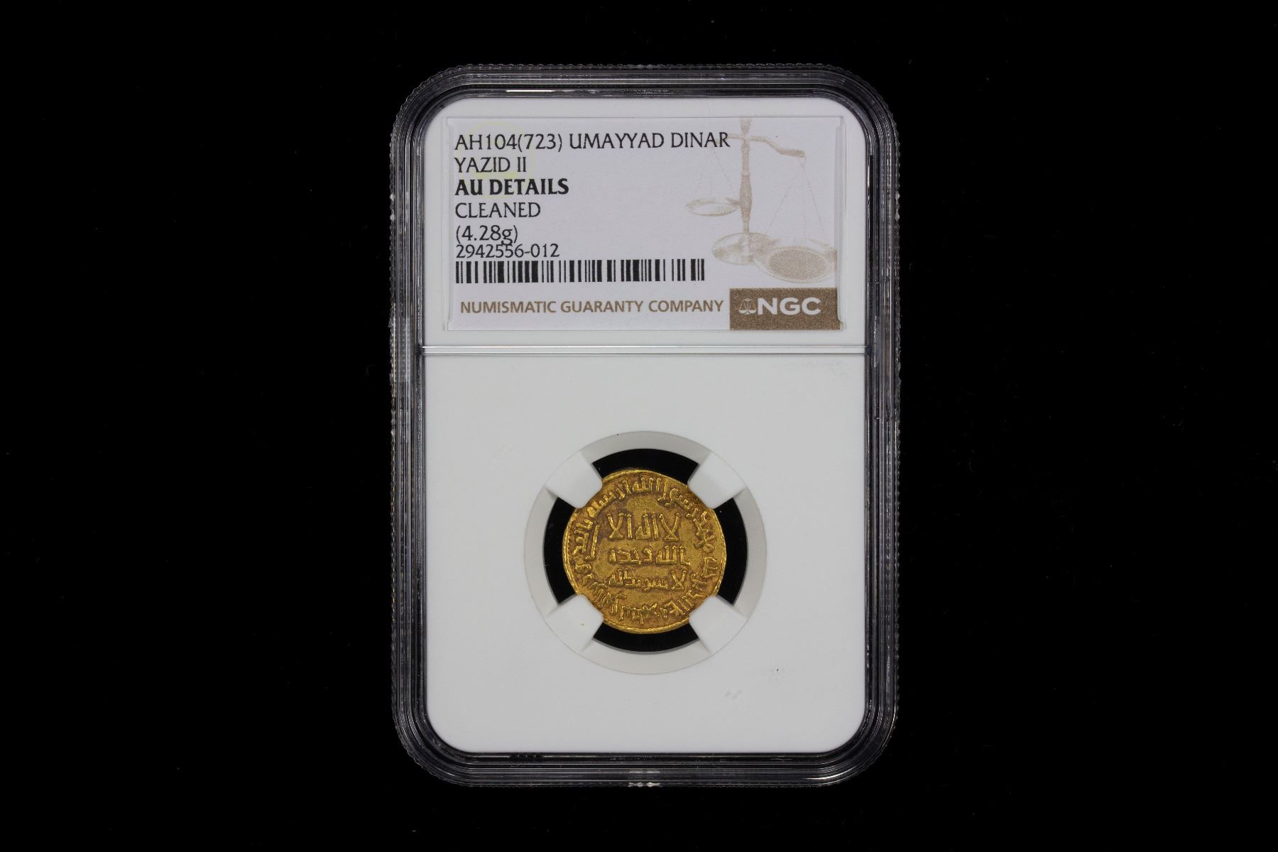 UMAYYAD: Yazid II, 720-724, AV dinar (4.28g), NM (Dimashq), AH104, A-134, NGC graded AU details.