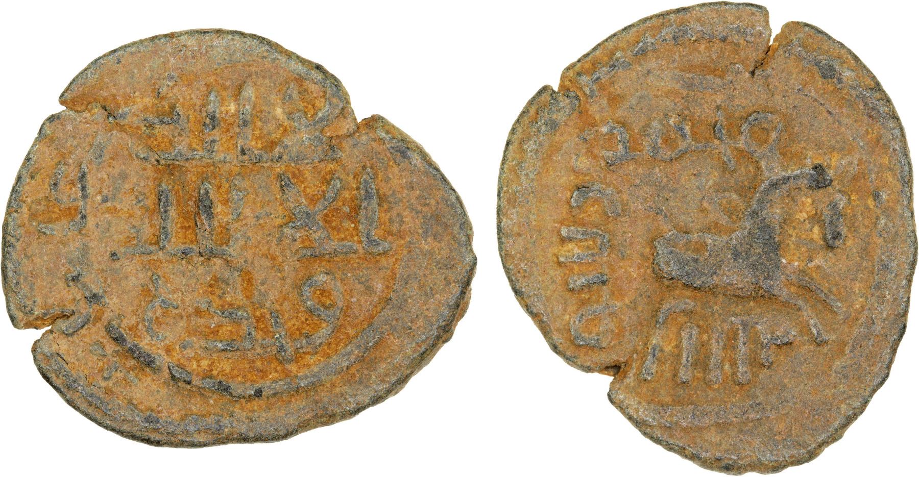 UMAYYAD: ca. 730s/740s (2.06g), NM, A-157, SNAT-537/538, kalima divided between obverse & reverse, forepart of horse on the reverse; struck in Palestine; decent patination, VF, RR.
