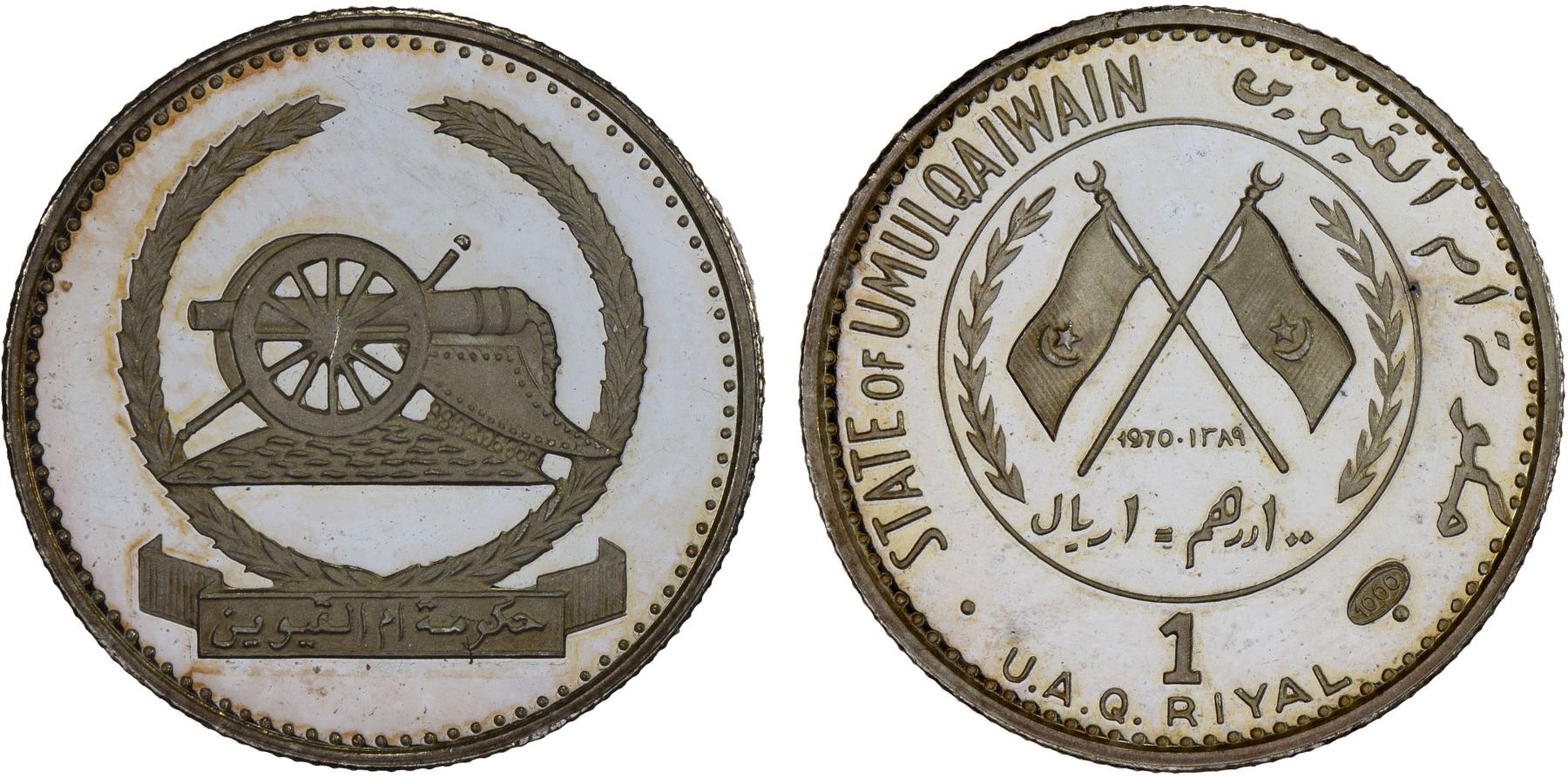 UMM AL QIWAIN: Ahmad Bin Rashid al-Mualla, 1929-1981, AR riyal, 1970/AH1389, KM-1, Cannon, mintage of only 2,050 pieces, scarce, Proof, ex Dr. Wolfgang Schuster Collection.