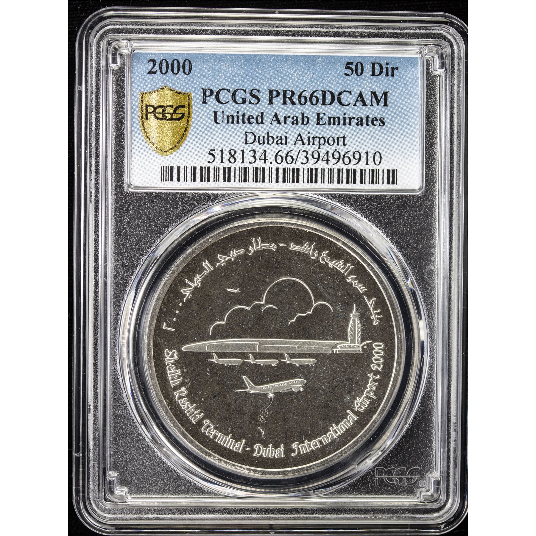 UNITED ARAB EMIRATES: AR 50 dirhams, 2000, KM-48, Inauguration of Sheikh Rashid's Terminal at Dubai International Airport, PCGS graded PF66 DC. Struck at the Münze Österreich (Austrian Mint) in Vienna.