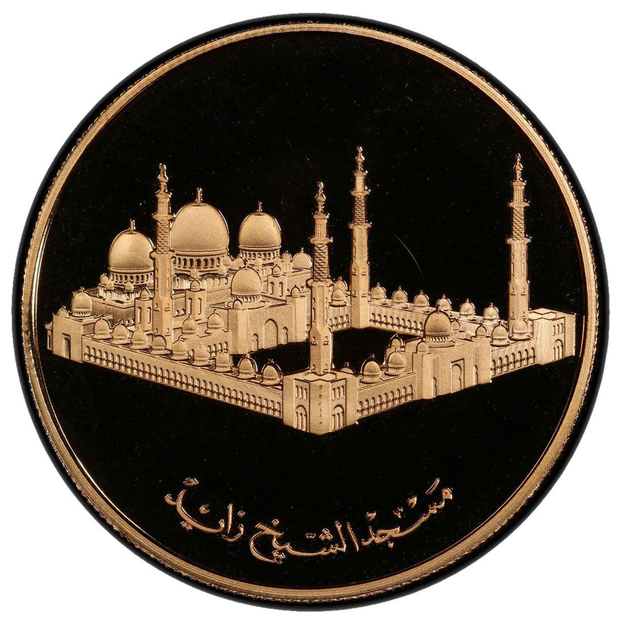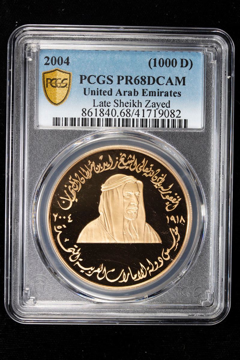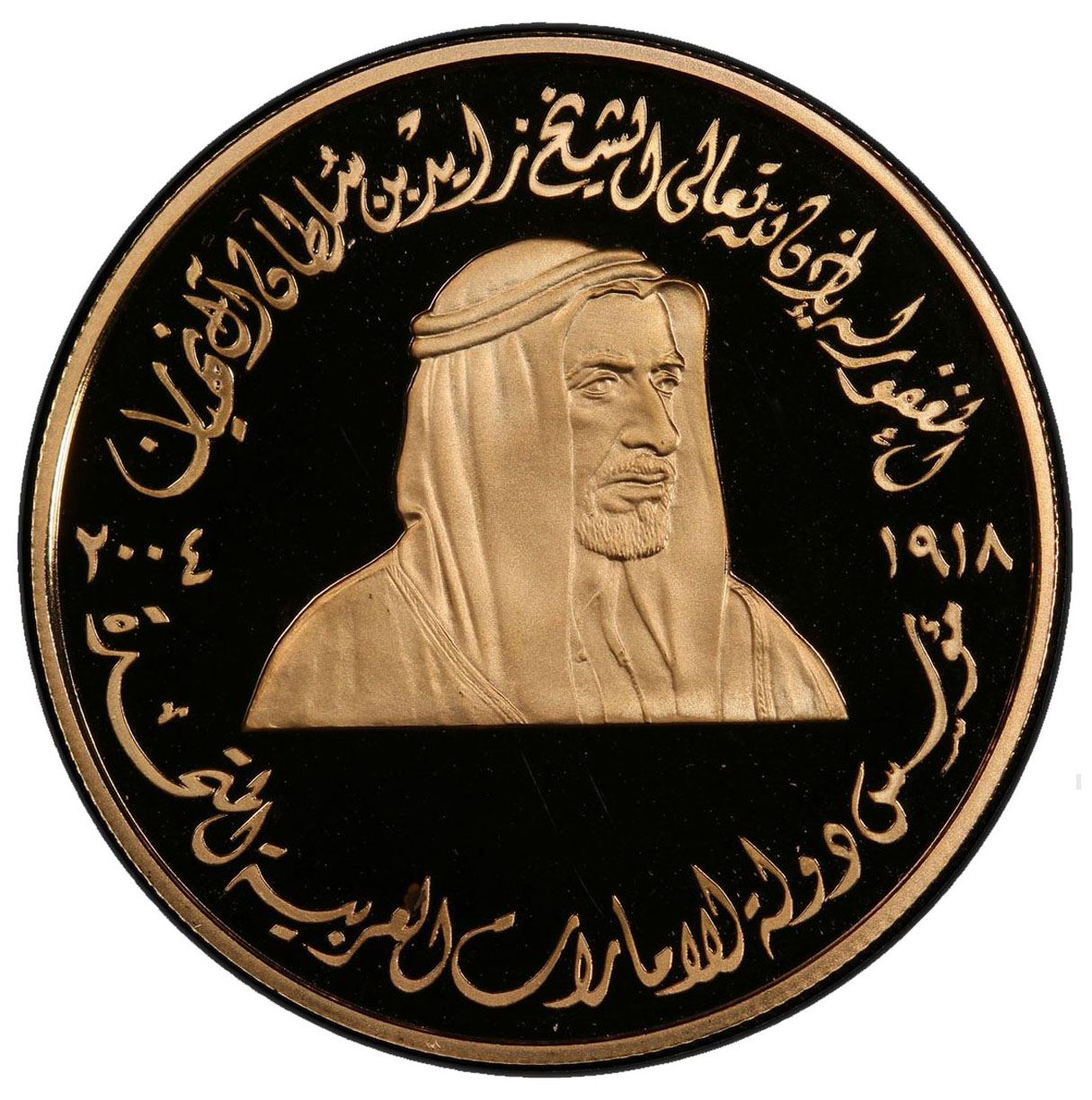 UNITED ARAB EMIRATES: AV 1000 dinars (40.00g), 2004, medallic issue, Commemoration of Late His Highness Sheikh Zayed bin Sultan Al Nahyan, PCGS graded Proof 68 DCAM.