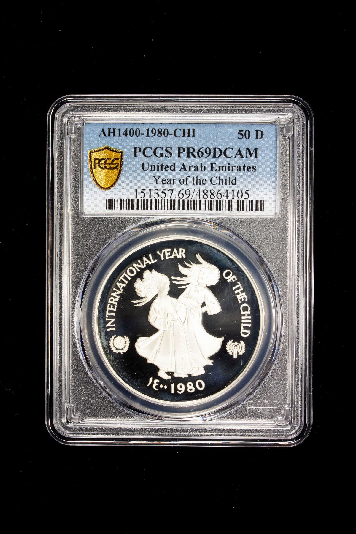 UNITED ARAB EMIRATES: Ahmad Bin Rashid al-Mualla, 1929-1981, AR 50 dirhams, 1980/AH1400, KM-7, International Year of the Child and UNICEF, mintage of only 8.031 pieces, PCGS graded Proof 69 DCAM, S.