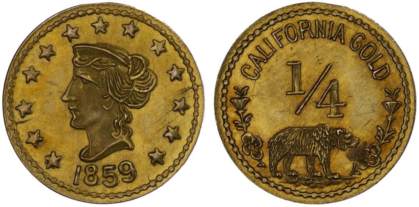UNITED STATES: "1/4" charm (0.25g), "1859" (ca. 1930s), Locke-2/2, 10mm gilt brass round "California Gold" token, Liberty head type 2 left with "1859" below and 13 stars around // #2 bear at bottom with "1/4" above with floral wreath around and CALIFORNIA GOLD at top, semi-prooflike, a few hairlines, plain edge, Unc. The type numbers refer to Mike Locke's catalog. Struck by Tatham in the early to mid-20th century. These are common, but scarce with the gilding intact such as this piece.