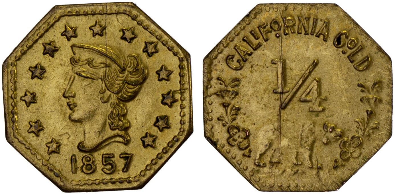 UNITED STATES: "1/4" charm (0.30g), 1857, Locke-1/3, 10mm gilt brass octagonal "California Gold" token, Liberty head type 1 left with "1857" below and 13 stars around // #3 bear at bottom with "1/4" above with floral wreath around and CALIFORNIA GOLD at top, faint reverse scratch, plain edge, Unc. The type numbers refer to Mike Locke's catalog. Struck by Tatham in the early to mid-20th century. These are common, but scarce with the gilding intact such as this piece.