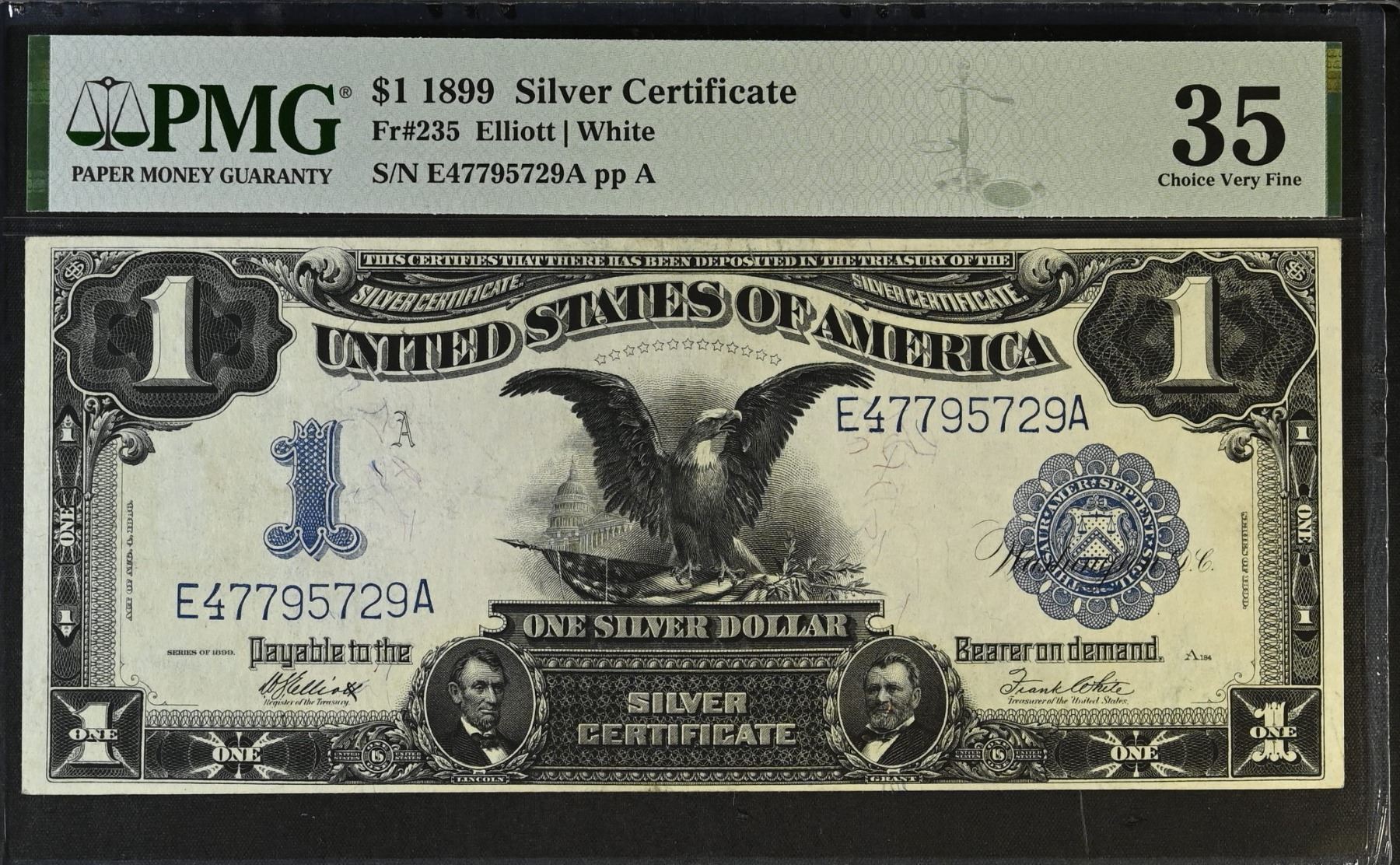 UNITED STATES: 1 dollar, 1899, Pick-338c, Fr-235, Silver Certificate, Black Eagle at center, Elliott and White signatures, great eye appeal for the grade, PMG graded VF35, ex Dr. Robert A. Rosenfeld Collection.