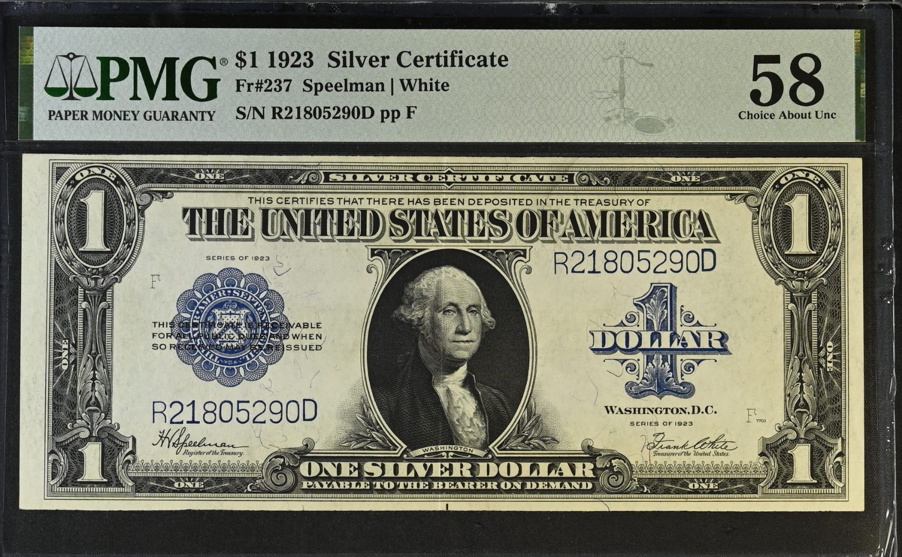 UNITED STATES: 1 dollar, 1923, Pick-342, Fr-237, Silver Certificate, Washington portrait, Speelman and White signatures, bright and attractive, PMG graded AU58, ex Dr. Robert A. Rosenfeld Collection.
