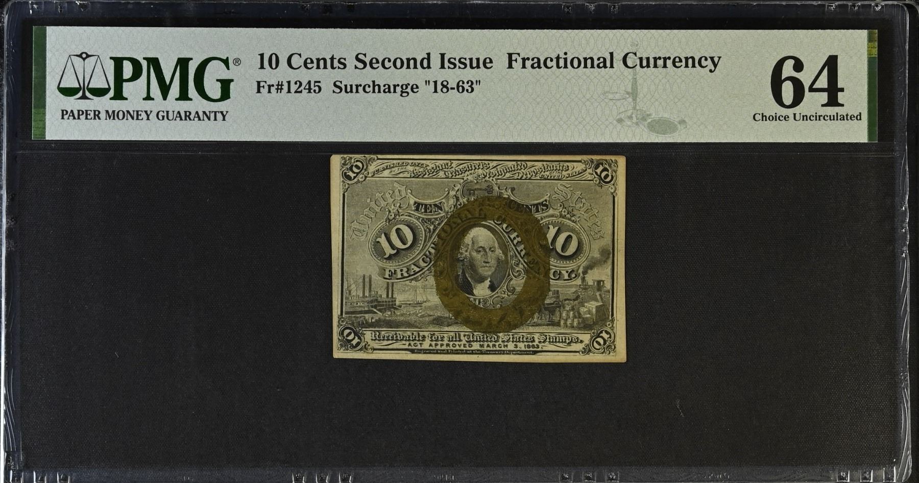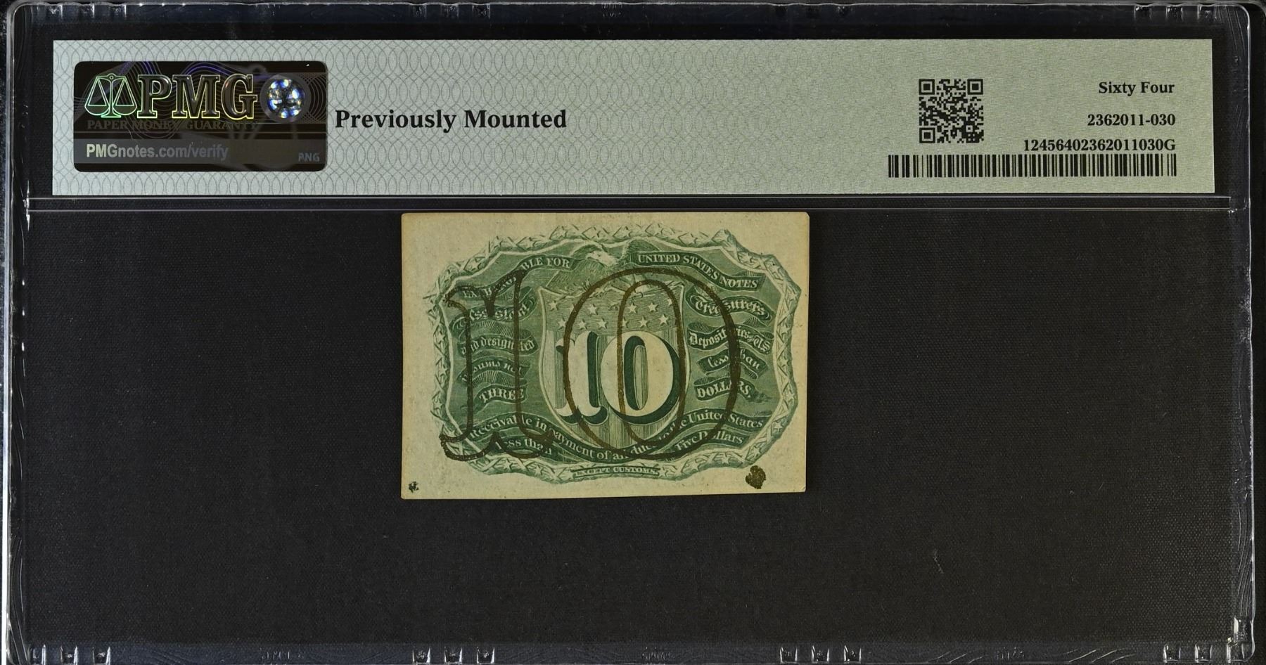 UNITED STATES: 10 cents, 3.3.1863, Pick-102b, Fr-1245, Fractional Currency, Second Issue, with "18-63" overprint, label says "Previously Mounted", but we can't see it, PMG graded MS64, ex Dr. Robert A. Rosenfeld Collection.