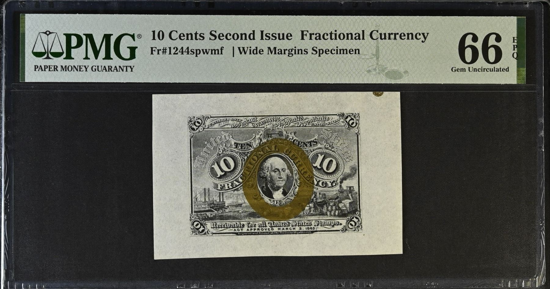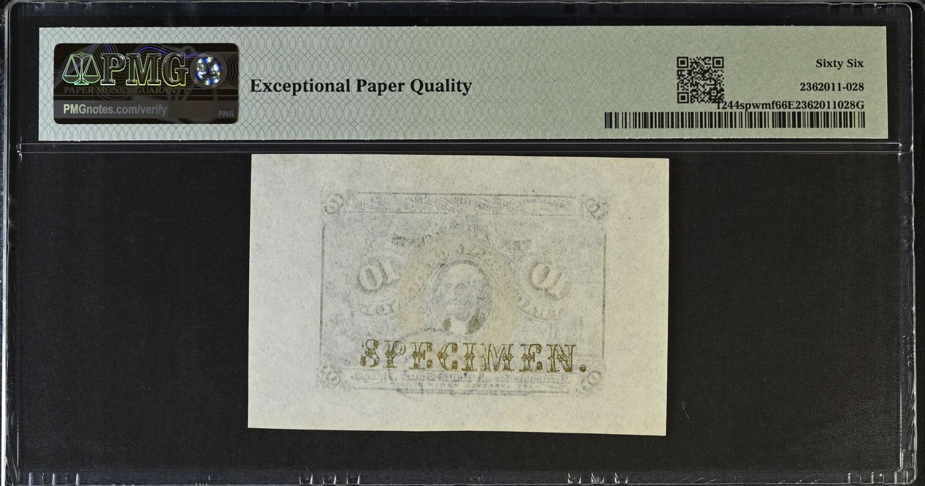 UNITED STATES: 10 cents, 3.3.1863, Fr-1244spwmf, cf. Pick-102, Fractional Currency, Second Issue, obverse specimen with wide margins, a spectacular example! PMG graded Specimen 66 EPQ, ex Dr. Robert A. Rosenfeld Collection.