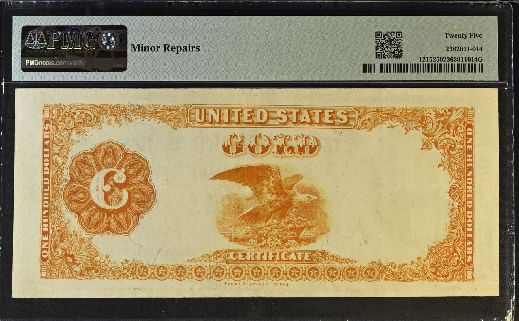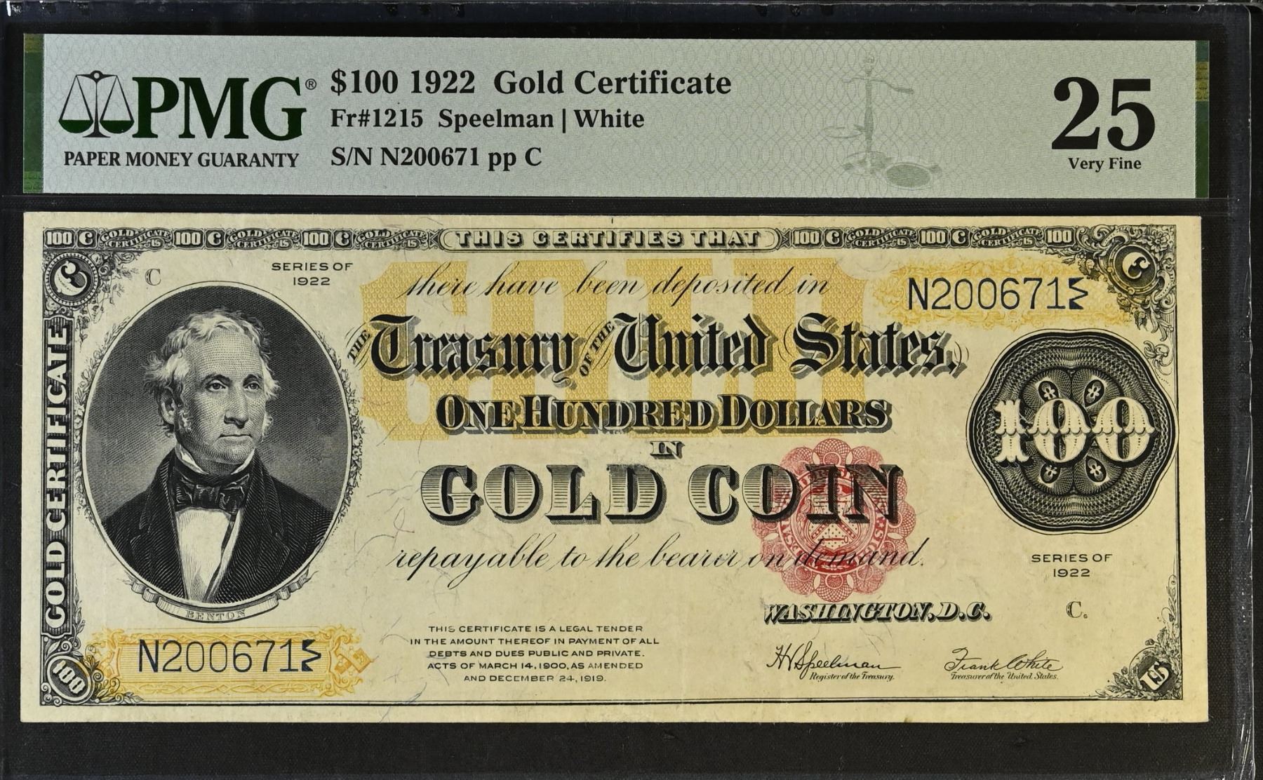 UNITED STATES: 100 dollars, 1922, Pick-277, Fr-1215, Gold Certificate, Thomas H. Benton portrait, Speelman and White signatures, Very Minor Repairs, but nice appearance, PMG graded VF25, ex Dr. Robert A. Rosenfeld Collection.