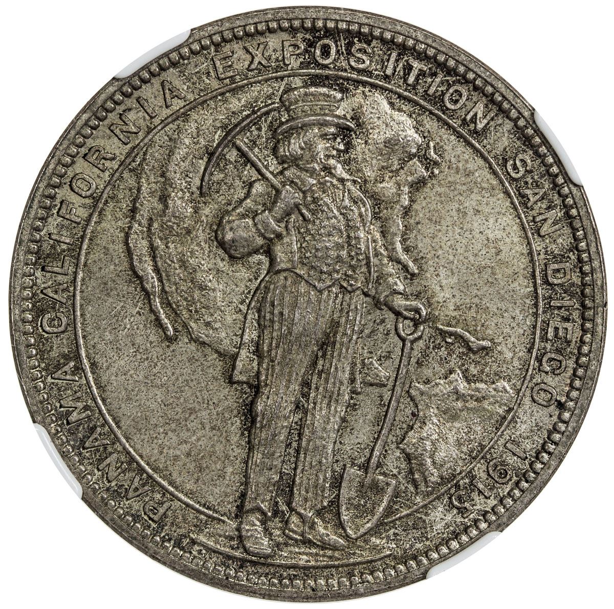 UNITED STATES:1915, silver medal, H&K-426, NGC graded MS65, "So-Called Dollar", Panama-California Exposition, official mint medal, full figure of Uncle Sam to right, with pick in right hand over shoulder and shovel in left hand, the two American Continents in background and handle of shovel lies across the Canal Zone, all within center circle; PANAMA CALIFORNIA EXPOSITION SAN DIEGO 1915 in outer margin // PANAMA CANAL OPENED BY S.S. ANCON above, OFFICIAL SOUVENIR in smaller letters just below, the S.S. Ancon, an American cargo and passenger ship being the first ship to officially transit the Panama Canal, AUG. 15. 1914 in exergue, R.    These Official Silver Medals were designed by C. K. Berryman, a Cartoonist for the Washington Star and engraved by Charles. E. Barber, Chief Engraver of the U.S. Mint and struck by the Mint Exhibit on the fairgrounds. This was first and only official exposition medal with Uncle Sam as the main design. Also, the striking of this issue for both years of the exposition represented the first occasion "where a medal of this character had been minted and dated for different years."