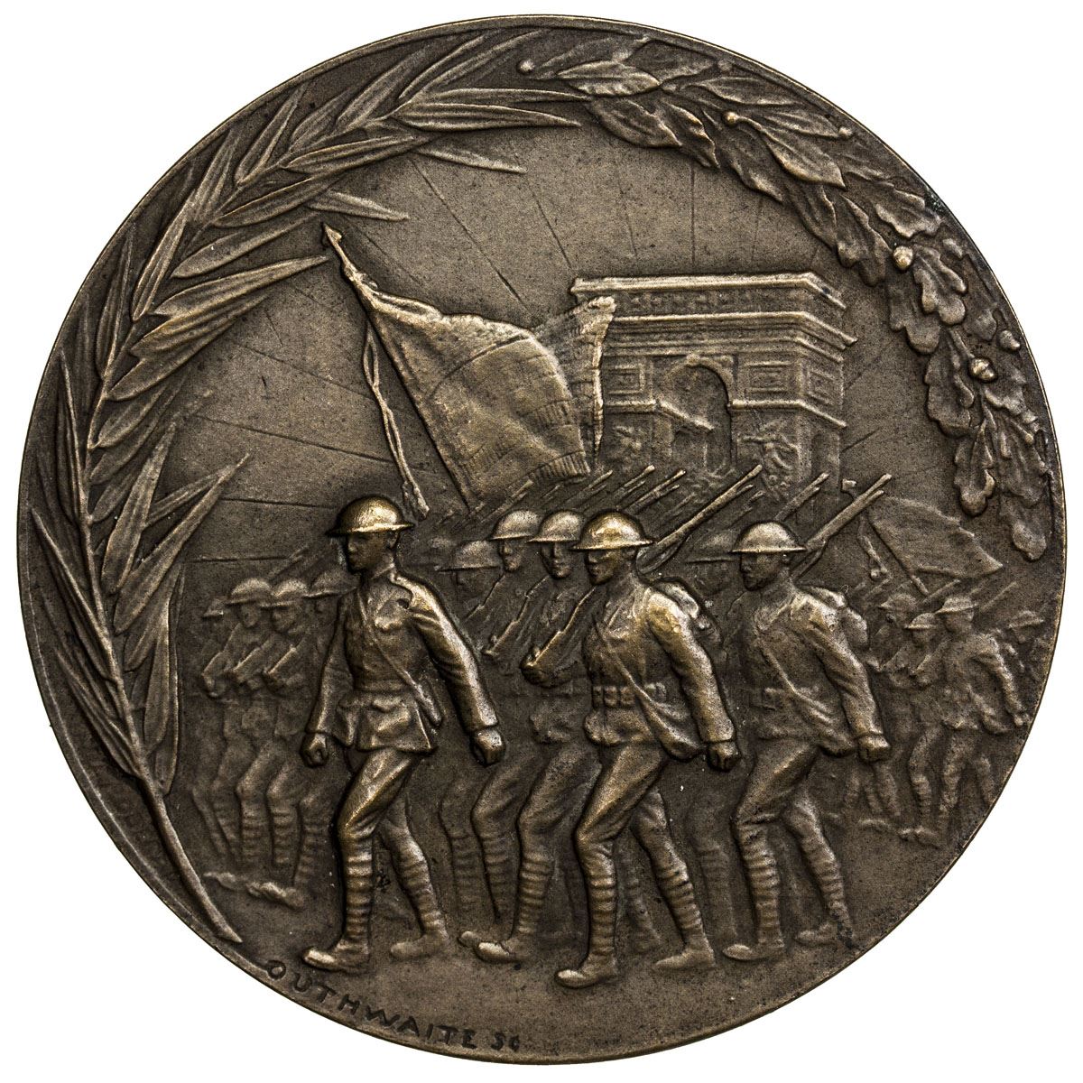 UNITED STATES:1919, bronze medal, H&K-903, AU, 45mm, 45.14g: World War I, The Saviors of the Liberty of the World, 1919: Statue of Liberty behind row of flags, eagle below // American soldiers marching past the Arc de Triomphe in Paris, signed by Outhwaite Sc, in original box, labeled "Médaille Commemorative de la Victoire 1919", RR.