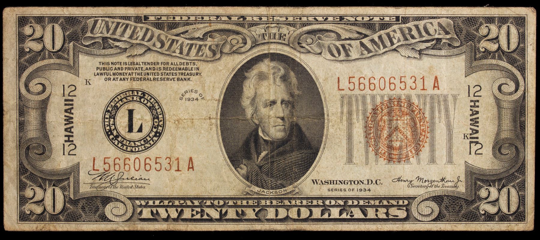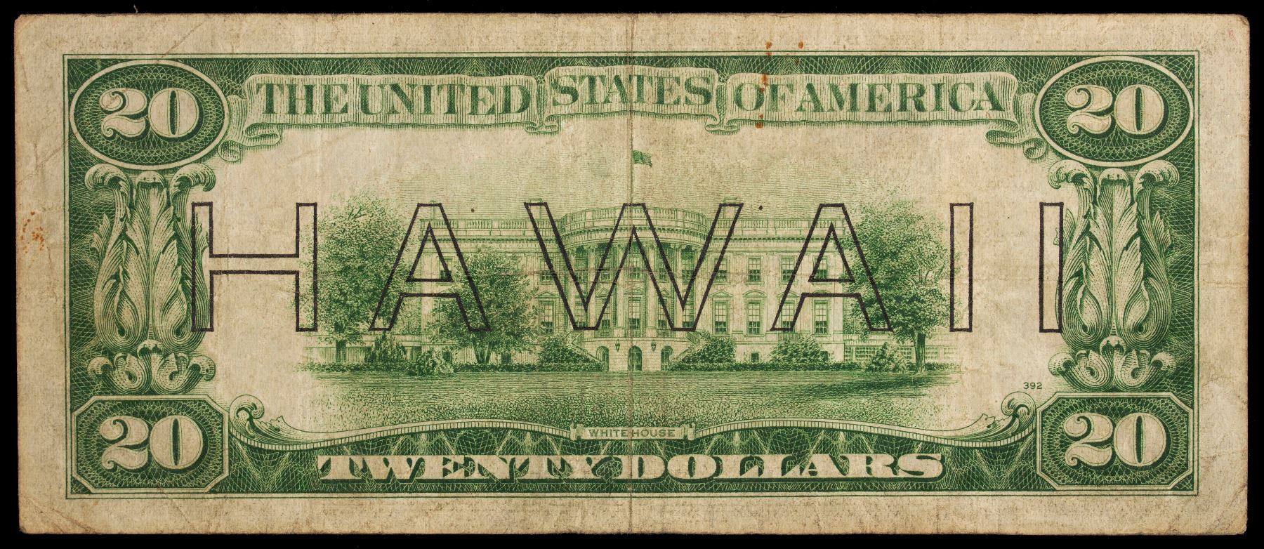 UNITED STATES: 20 dollars, 1934, Fr-2304m, Federal Reserve Emergency note, with Hawaii overprint with brown seal, mule with reverse check number 392, Fine.