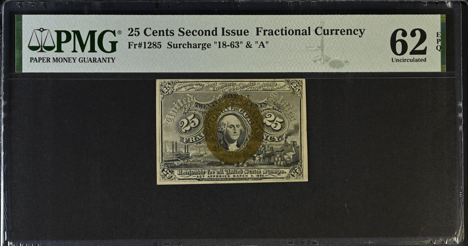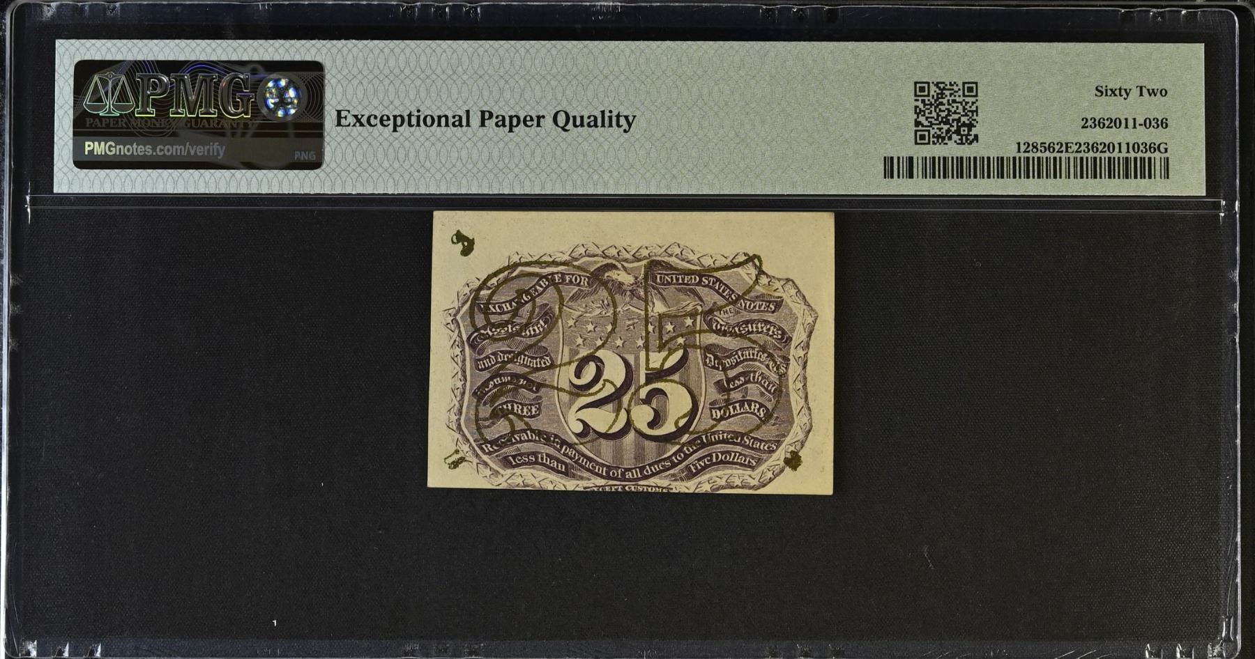 UNITED STATES: 25 cents, 3.3.1863, Pick-103c, Fr-1285, Fractional Currency, Second Issue, bluish tint at right side of obverse, overprint with "18-63" and "A", pleasing appearance, PMG graded MS62 EPQ, ex Dr. Robert A. Rosenfeld Collection.