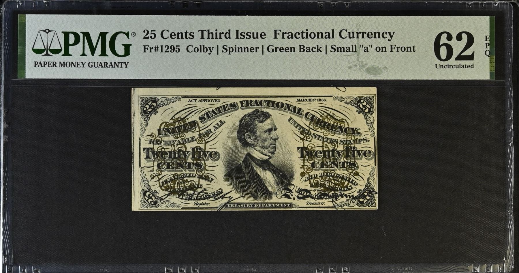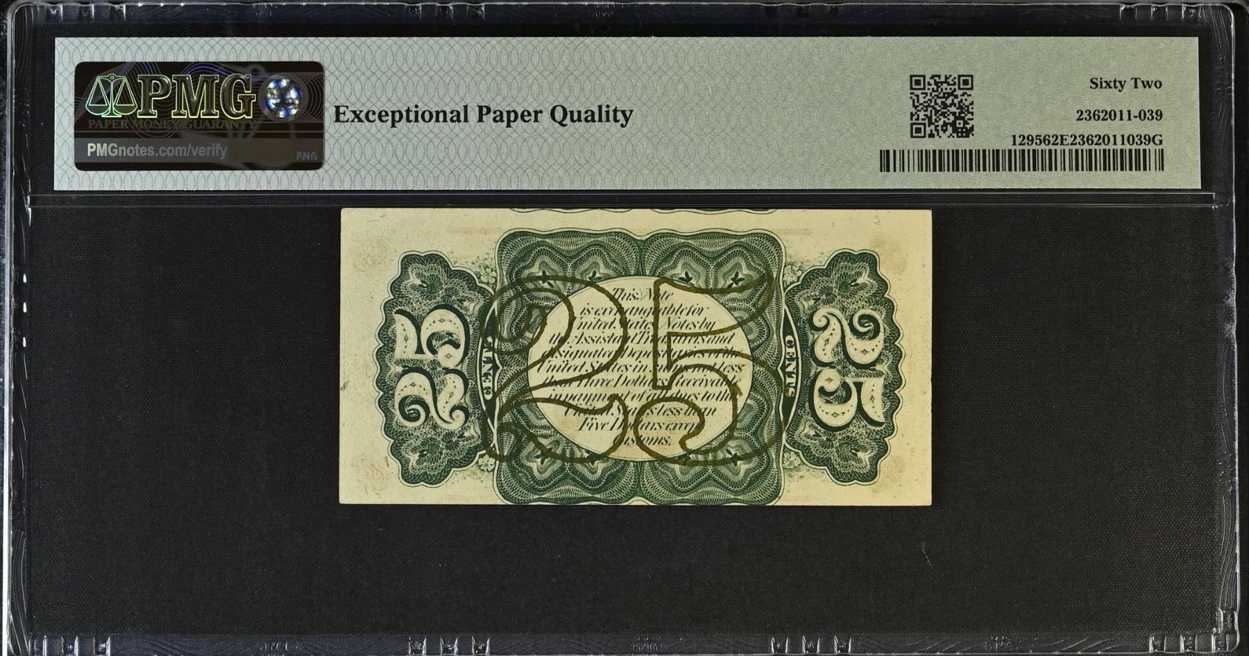 UNITED STATES: 25 cents, 3.3.1863, Pick-109e, Fr-1295, Fractional Currency, Third Issue, Colby and Spinner signatures, green back, bright, PMG graded MS62 EPQ, ex Dr. Robert A. Rosenfeld Collection.