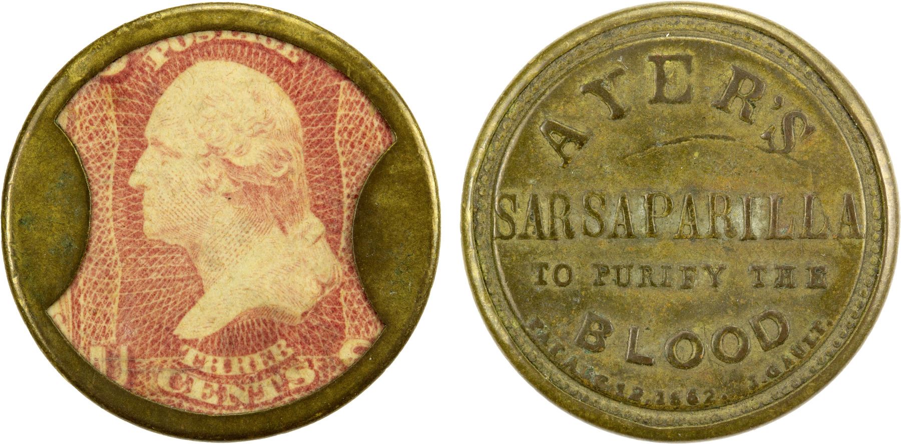 UNITED STATES: 3 cent encased postage, ND (1863), HB-30, EP-34A, Ayer's Sarsaparilla, Lowell, Massachusetts, Medium AYER'S, plain frame, mica and rose Scott-65 stamp both nice, with characteristic die crack below AYER'S, trace of silvering remains on case, VF-EF, S.