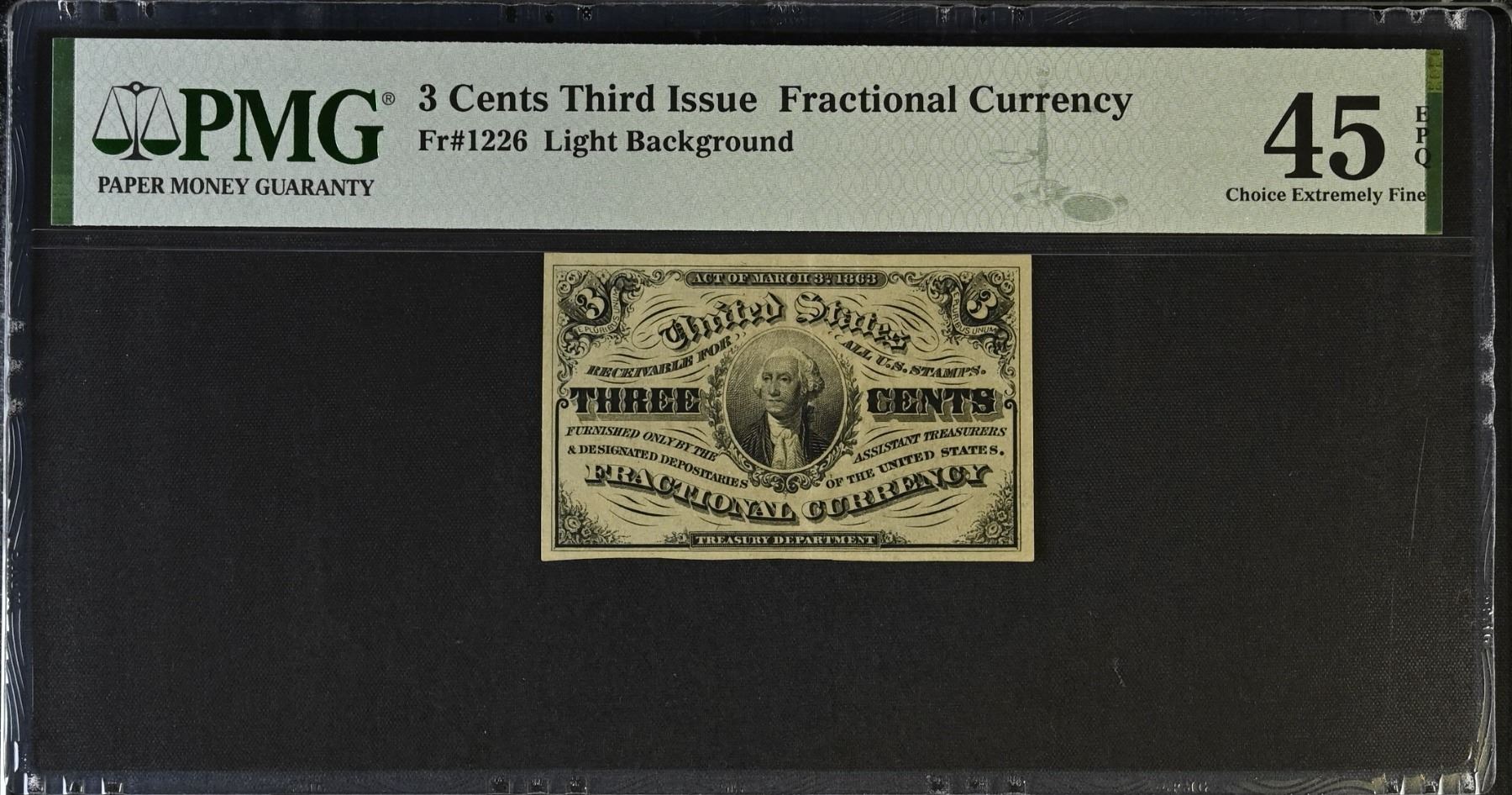 UNITED STATES: 3 cents, 3.3.1863, Pick-105a, Fr-1226, Fractional Currency, light background, very nice for the grade, PMG graded EF45 EPQ, ex Dr. Robert A. Rosenfeld Collection.
