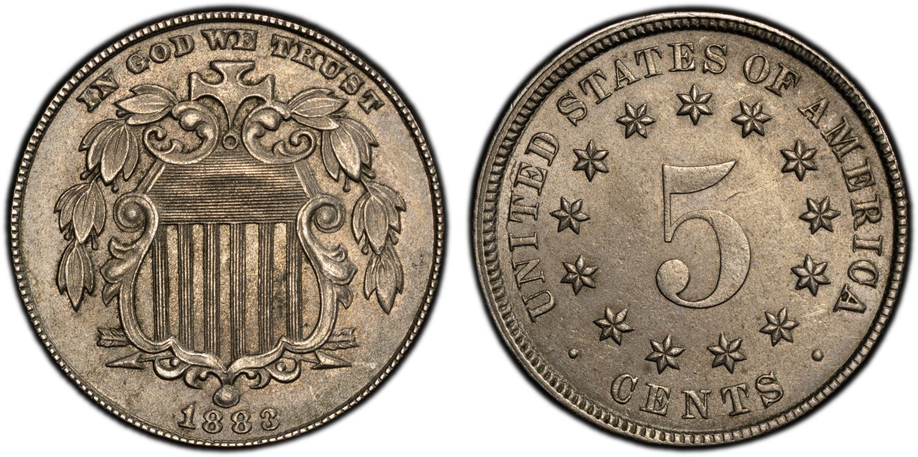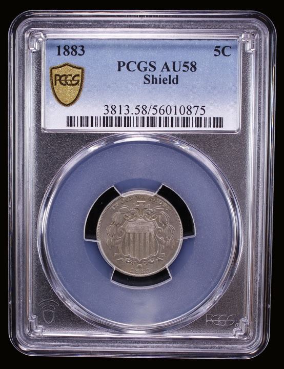UNITED STATES: 5 cents, 1866, KM-96, Shield type, an attractive nearly mint state example, PCGS graded AU58, ex Robert A. Rosenfeld Collection. Demand for nickels rose inexplicably in 1881, and to meet the demand, the Mint produced 68,800 nickels for circulation. Nonetheless, this was still the third lowest mintage for the entire Shield Nickel series, and this date remains scarce today.