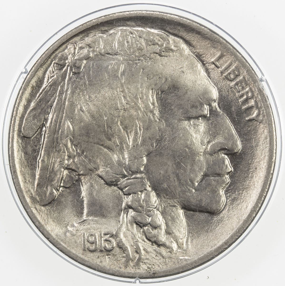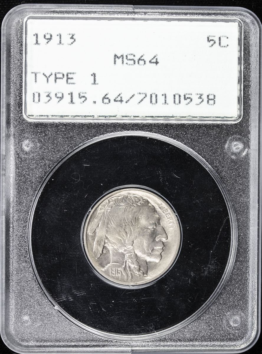 UNITED STATES: 5 cents, 1913, PCGS graded MS64, Buffalo type I, in OGH PCGS "rattler" GEN-1.2 holder. James Earle Fraser's new nickel debuted in late winter of 1913 amid much fanfare. Most Americans found favor with the design, and huge numbers of these coins were saved as souvenirs. This hoarding only increased when the reverse was modified a few months later. As in 1883, rumors spread that the original issue would be recalled which, of course, was not the case.