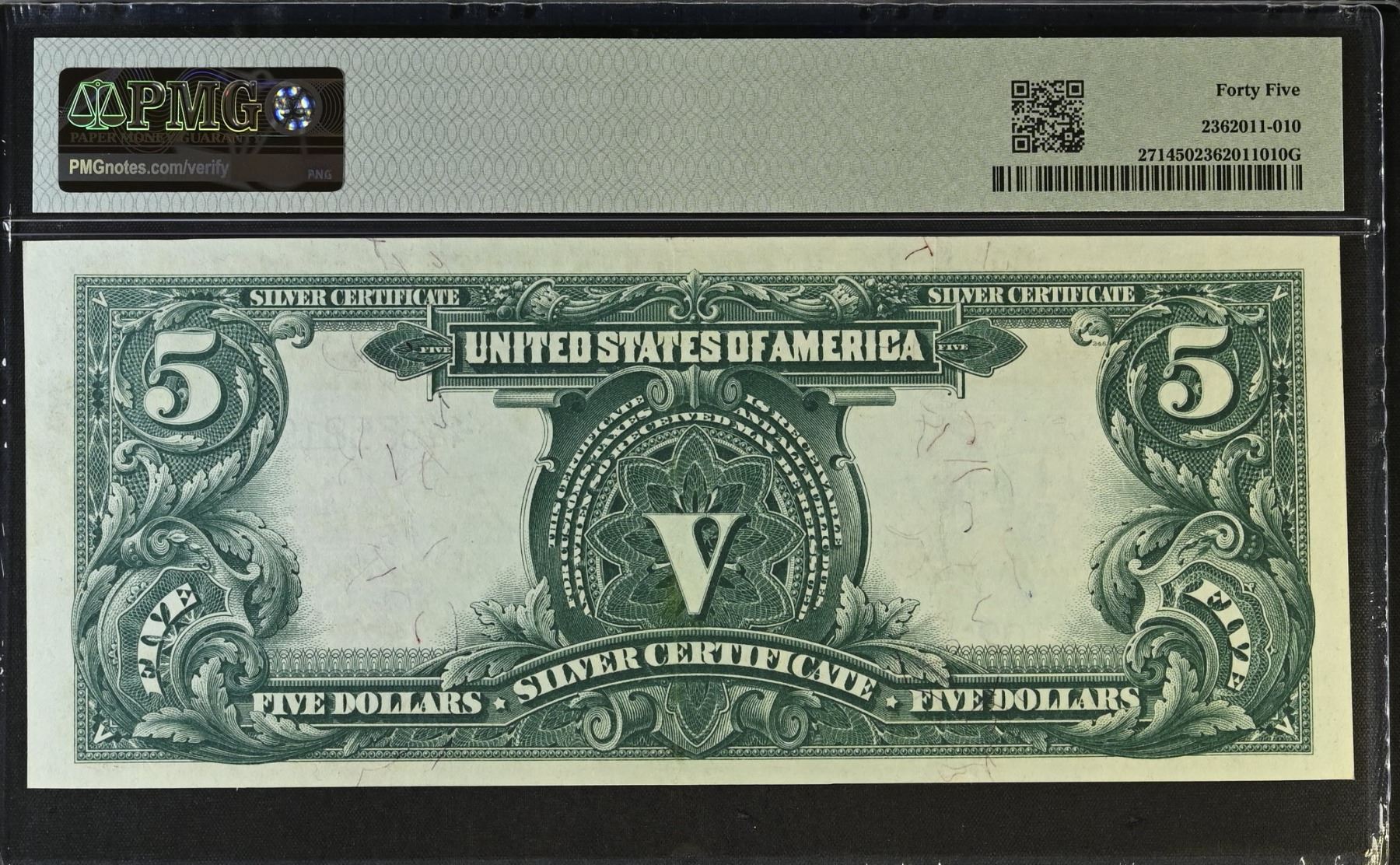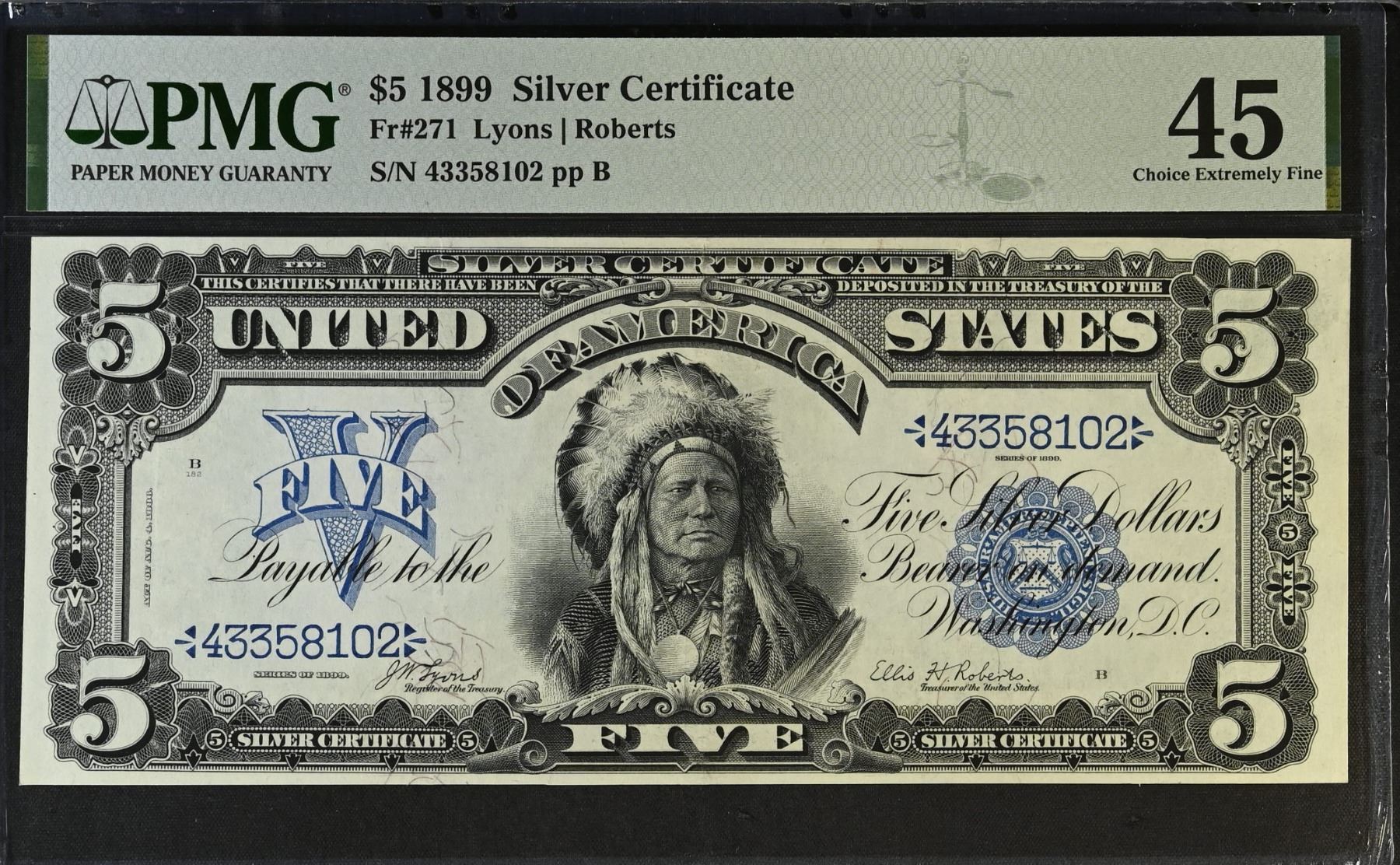 UNITED STATES: 5 dollars, 1899, Pick-340, Fr-271, Silver Certificate, Tatoka-Inyanka (Native American Chief) portrait, Lyons and Roberts signatures, great eye appeal, PMG graded EF45, ex Dr. Robert A. Rosenfeld Collection.
