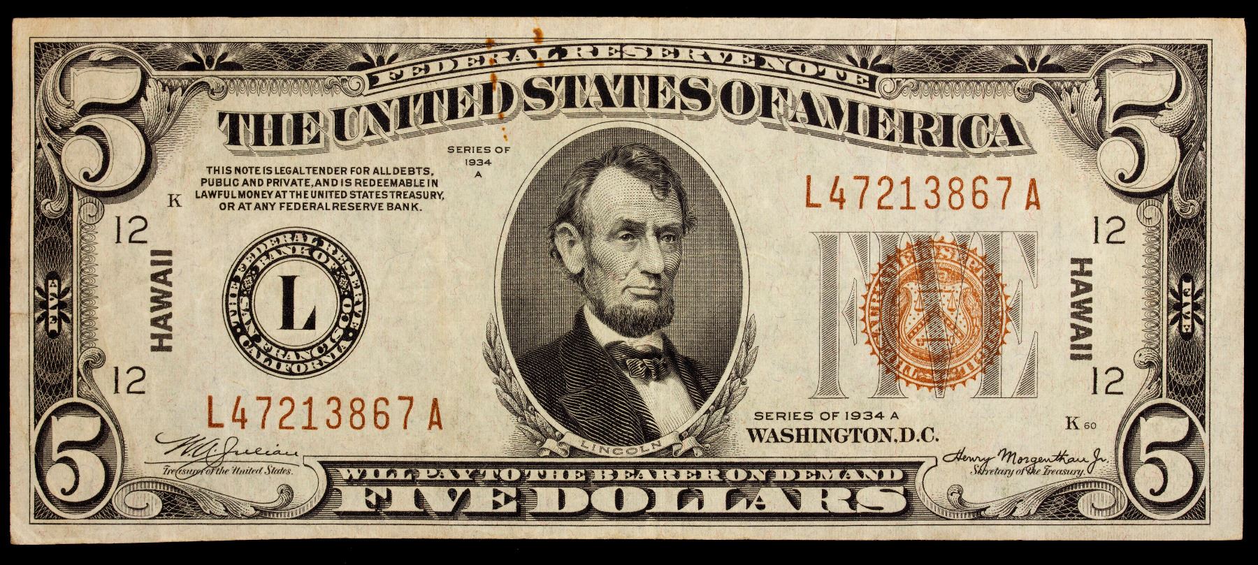 UNITED STATES: 5 dollars, 1934-A, Fr-2302, Federal Reserve Emergency note, with Hawaii overprint with brown seal, F-VF.
