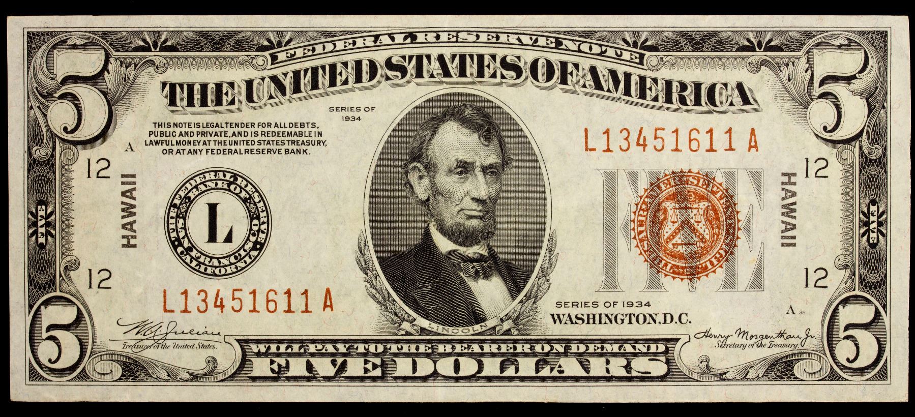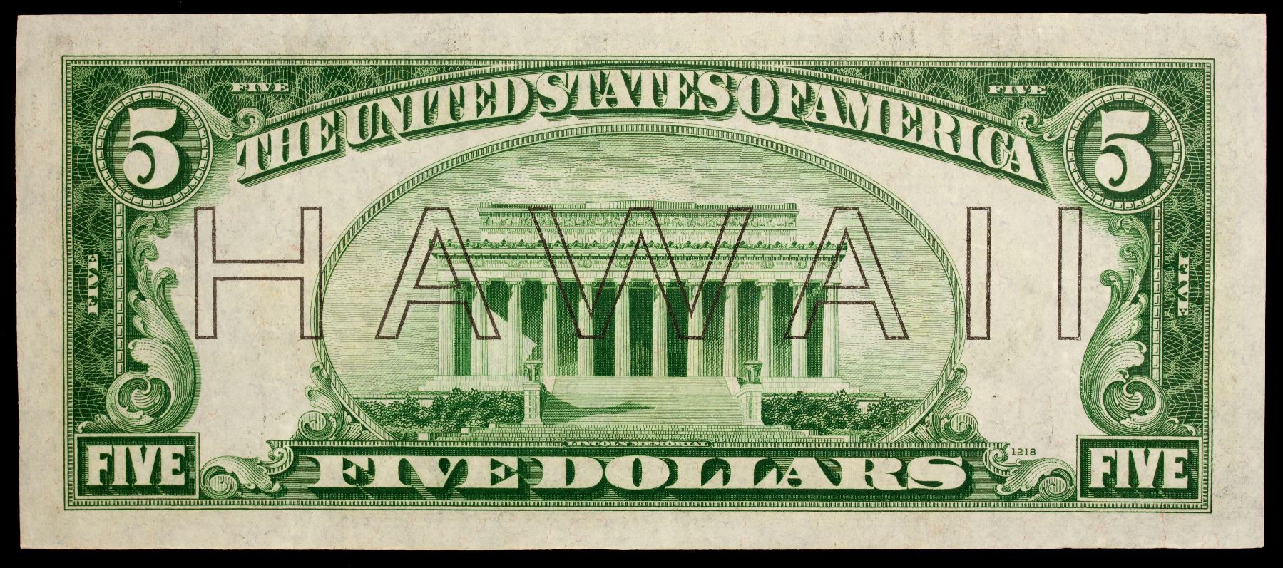 UNITED STATES: 5 dollars, 1934, Fr-2301m, Federal Reserve Emergency note, with Hawaii overprint with brown seal, mule with reverse check number 1218, VF-XF.
