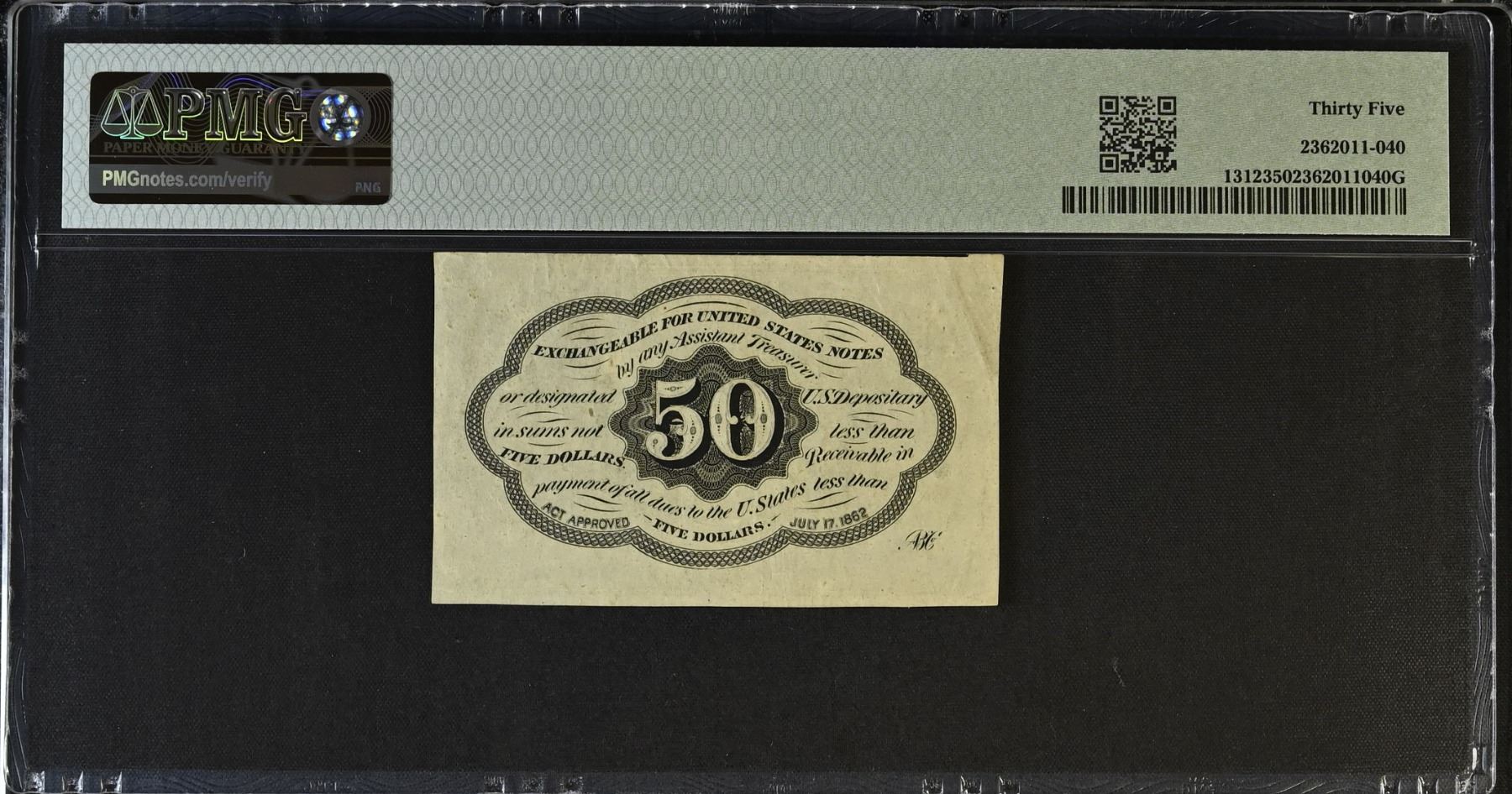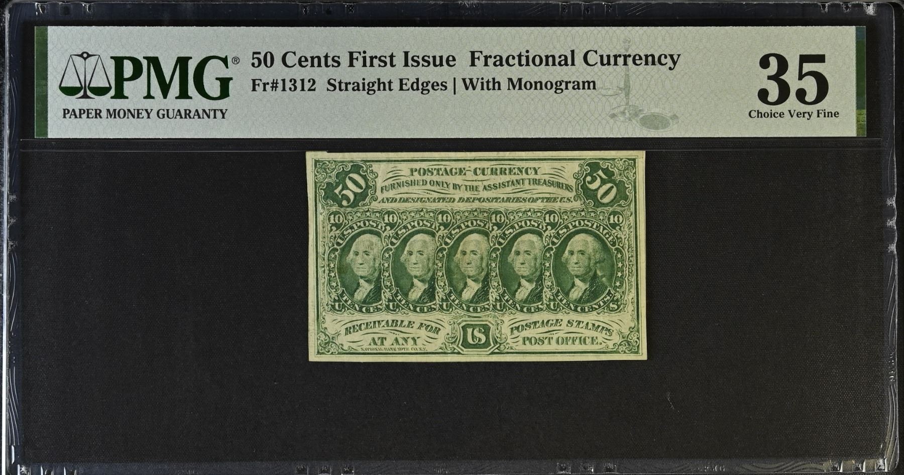 UNITED STATES: 50 cents, 17.7.1862, Pick-100d, Fr-1312, Fractional Currency, First Issue, straight edges with monogram on back, pleasing appearance, PMG graded VF35, ex Dr. Robert A. Rosenfeld Collection.