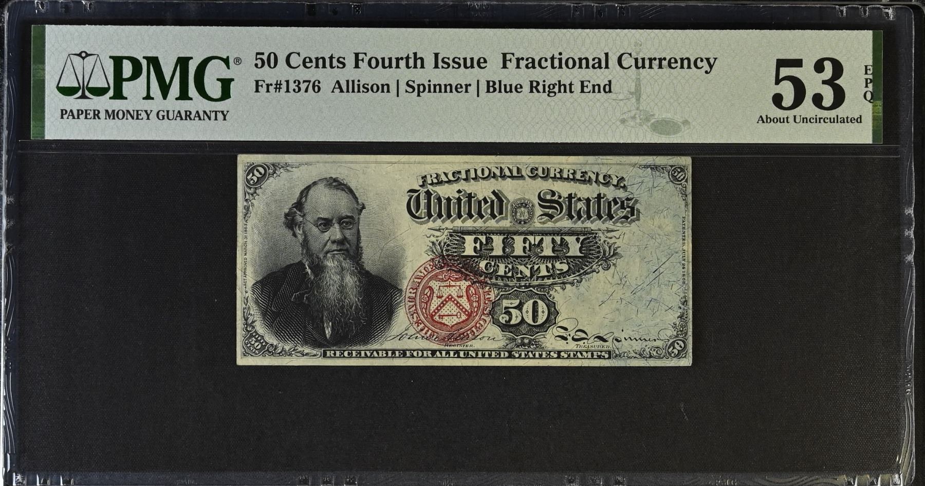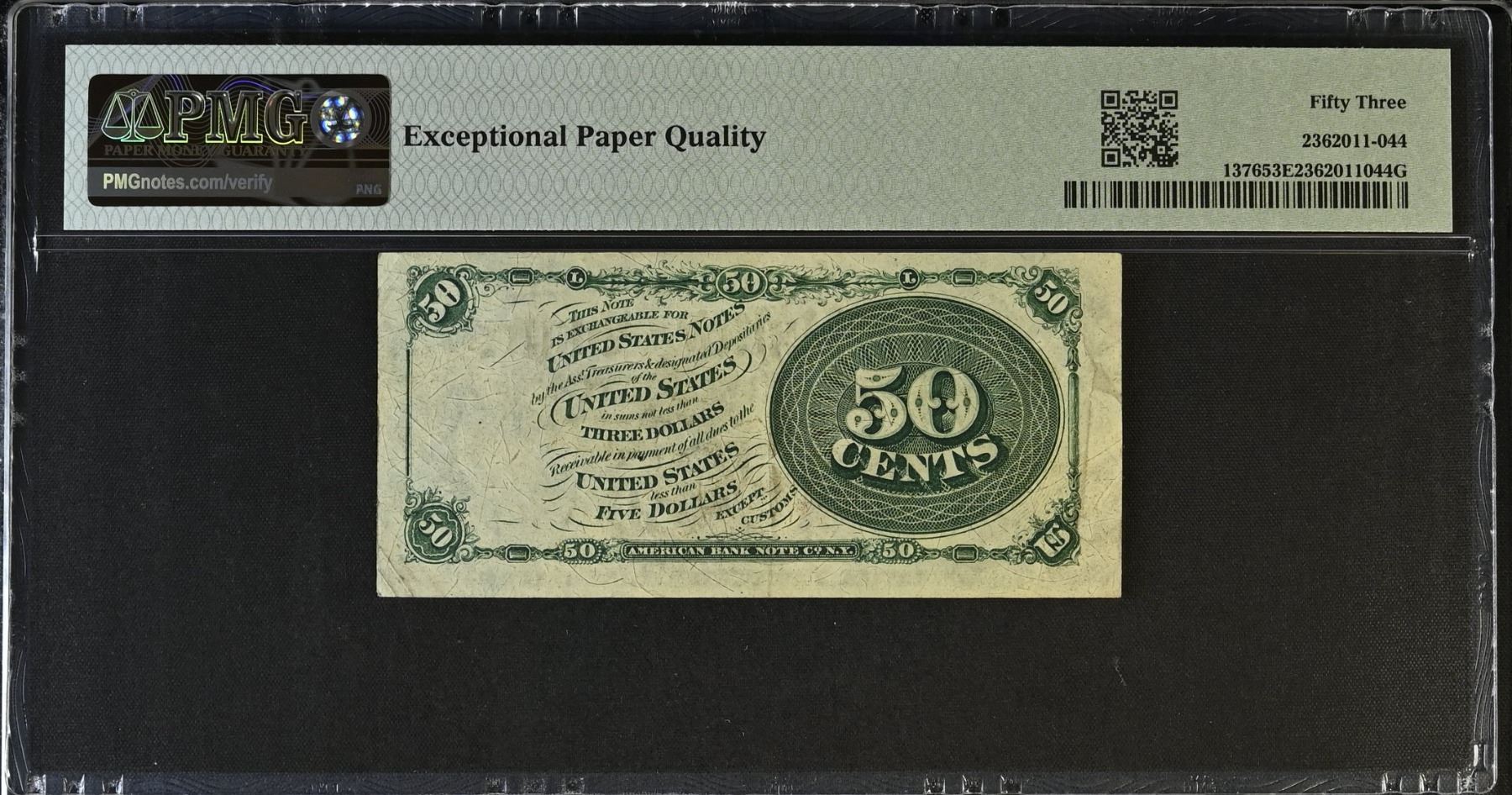UNITED STATES: 50 cents, 3.3.1863, Pick-120, Fr-1376, Fractional Currency, Fourth Issue, E. M. Stanton portrait, Allison and Spinner signatures, excellent eye appeal, PMG graded AU53 EPQ, ex Dr. Robert A. Rosenfeld Collection.
