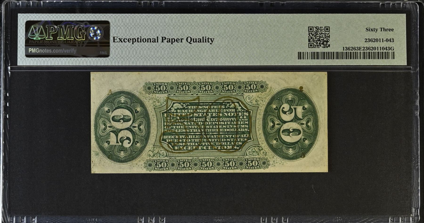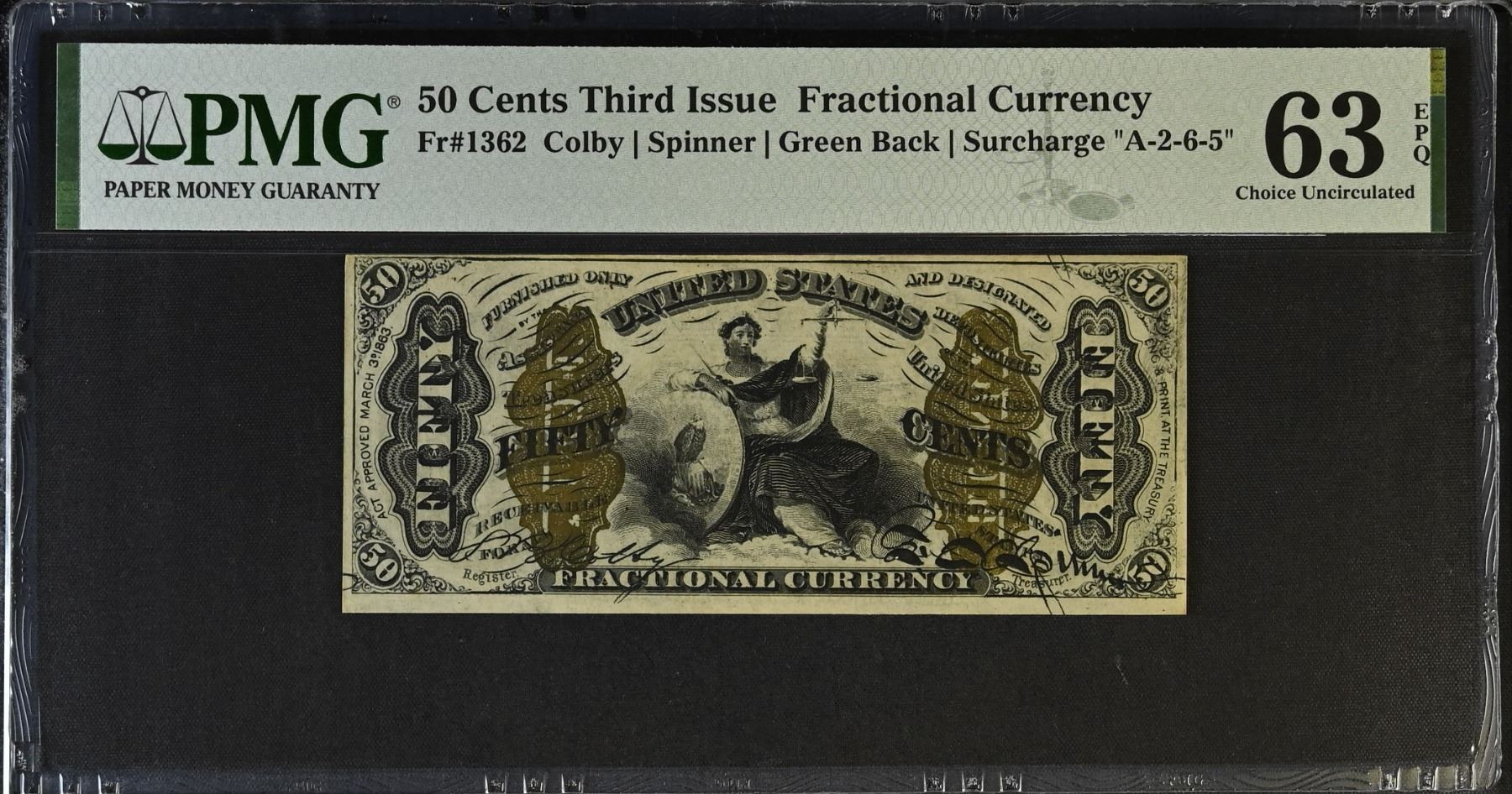 UNITED STATES: 50 cents, 3.3.1863, Pick-114i, Fr-1362, Fractional Currency, Third Issue, Justice Holding Scales, Colby and Spinner signatures, green back with "A-2-6-5" overprint on back, vibrant colors, PMG graded MS63 EPQ, ex Dr. Robert A. Rosenfeld Collection.