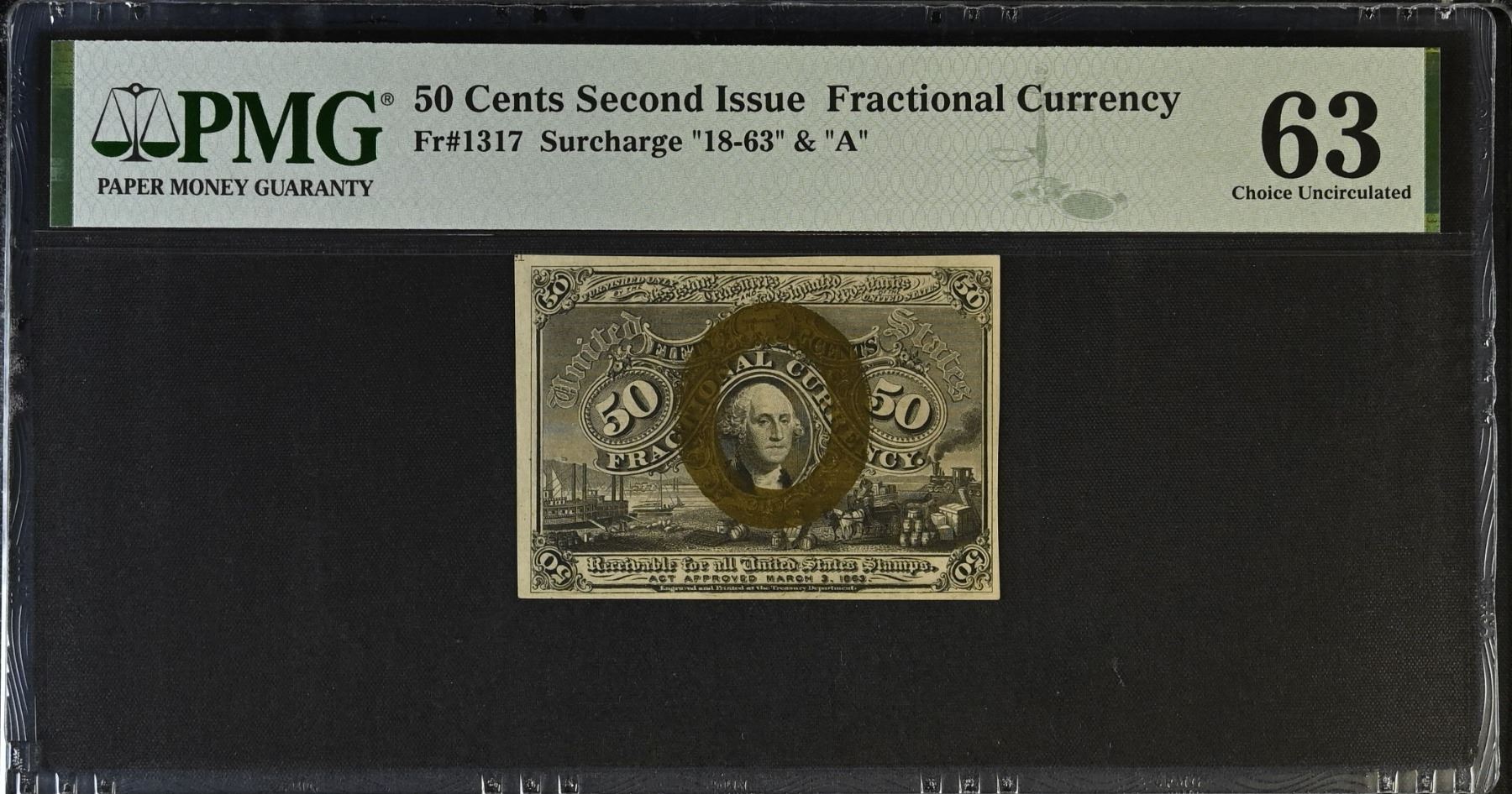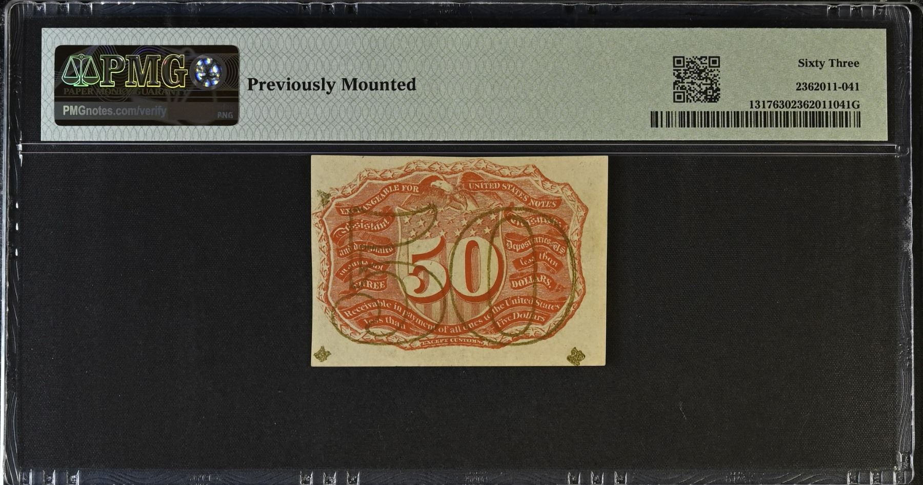 UNITED STATES: 50 cents, 3.3.1863, Pick-104b, Fr-1317, Fractional Currency, Second Issue, "18-63" and "A" overprint on back, "Previously Mounted" on label, but we are unable to find evidence, PMG graded MS63, ex Dr. Robert A. Rosenfeld Collection.