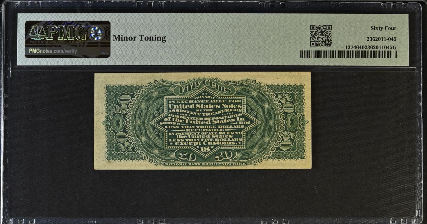 UNITED STATES: 50 cents, 3.3.1863, Pick-119a, Fr-1374, Fractional Currency, Fourth Issue, Lincoln portrait, Allison and Spinner signatures, "Minor Toning" on label, very nice appearance, PMG graded MS64, ex Dr. Robert A. Rosenfeld Collection.