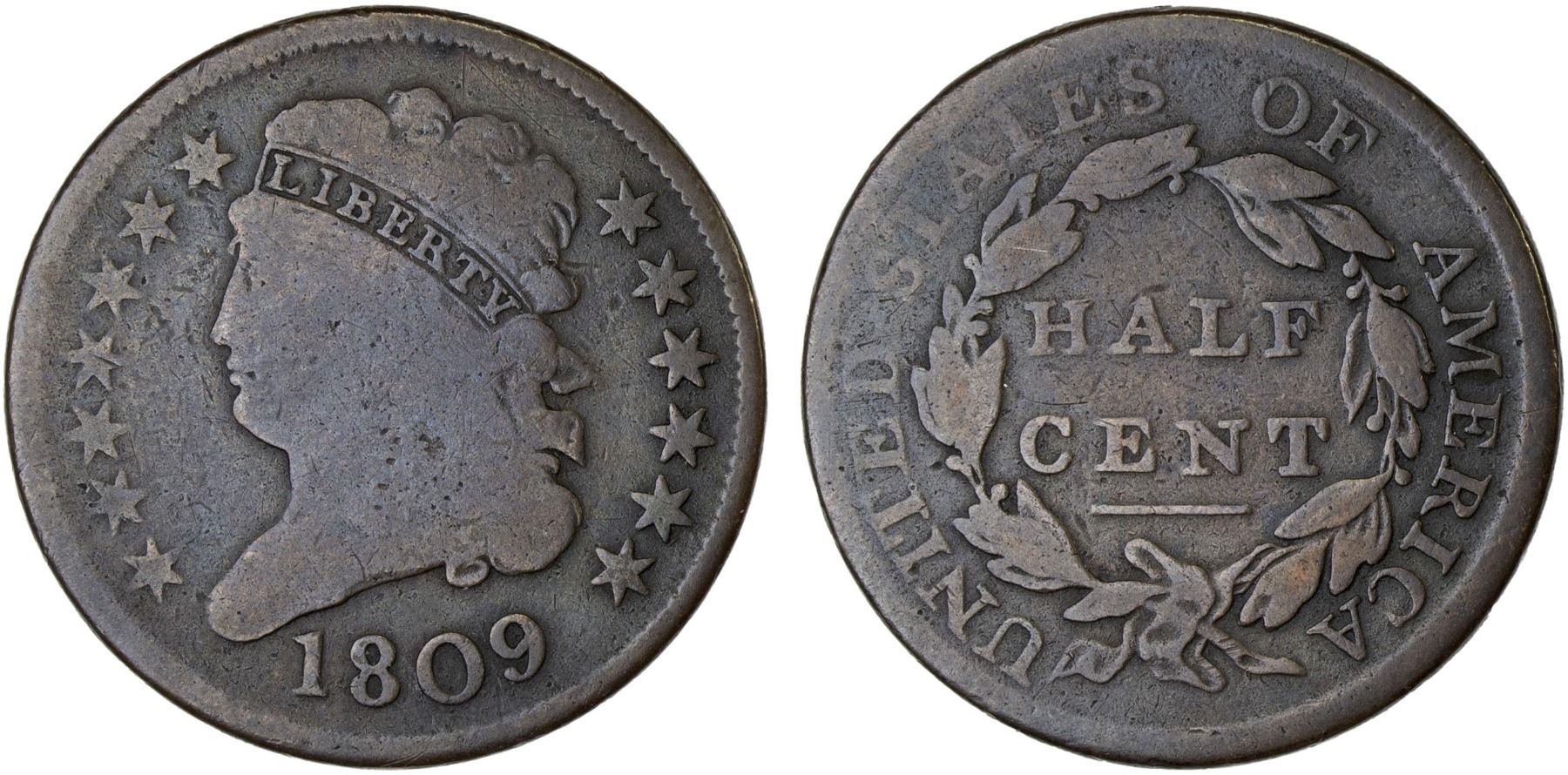 UNITED STATES: AE 1/2 cent, 1809, KM-41, Classic Head type, VG-F.