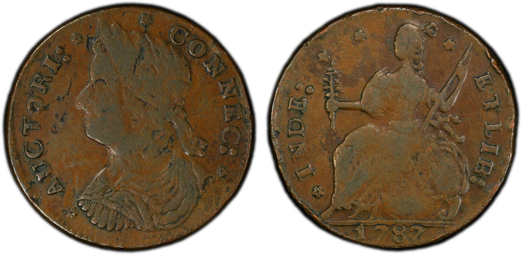 UNITED STATES: AE 1/2 penny, 1787, KM-3, Connecticut copper, draped bust left, PCGS graded VF30. Connecticut coppers have the most complex minting history of all colonial issues. There were more that 355 die combinations, with at least 126 type varieties having 26 distinct bust styles made by at least six different mints. Yet, the basic design of the Connecticut Coppers never changed; all issues imitated the British halfpenny. The obverse depicted the bust of a man wearing a laurel wreath, the figure sometimes faced to the left (as George II) or to the right (as George III) and was either clad in mail armor or draped in a toga. The obverse legend was one of several forms of Latin abbreviations for the phrase "By the authority of Connecticut." The reverse depicted a seated personification of Liberty closely resembling the British Britannia with a legend consisting of an abbreviated form of "Independence and Liberty."