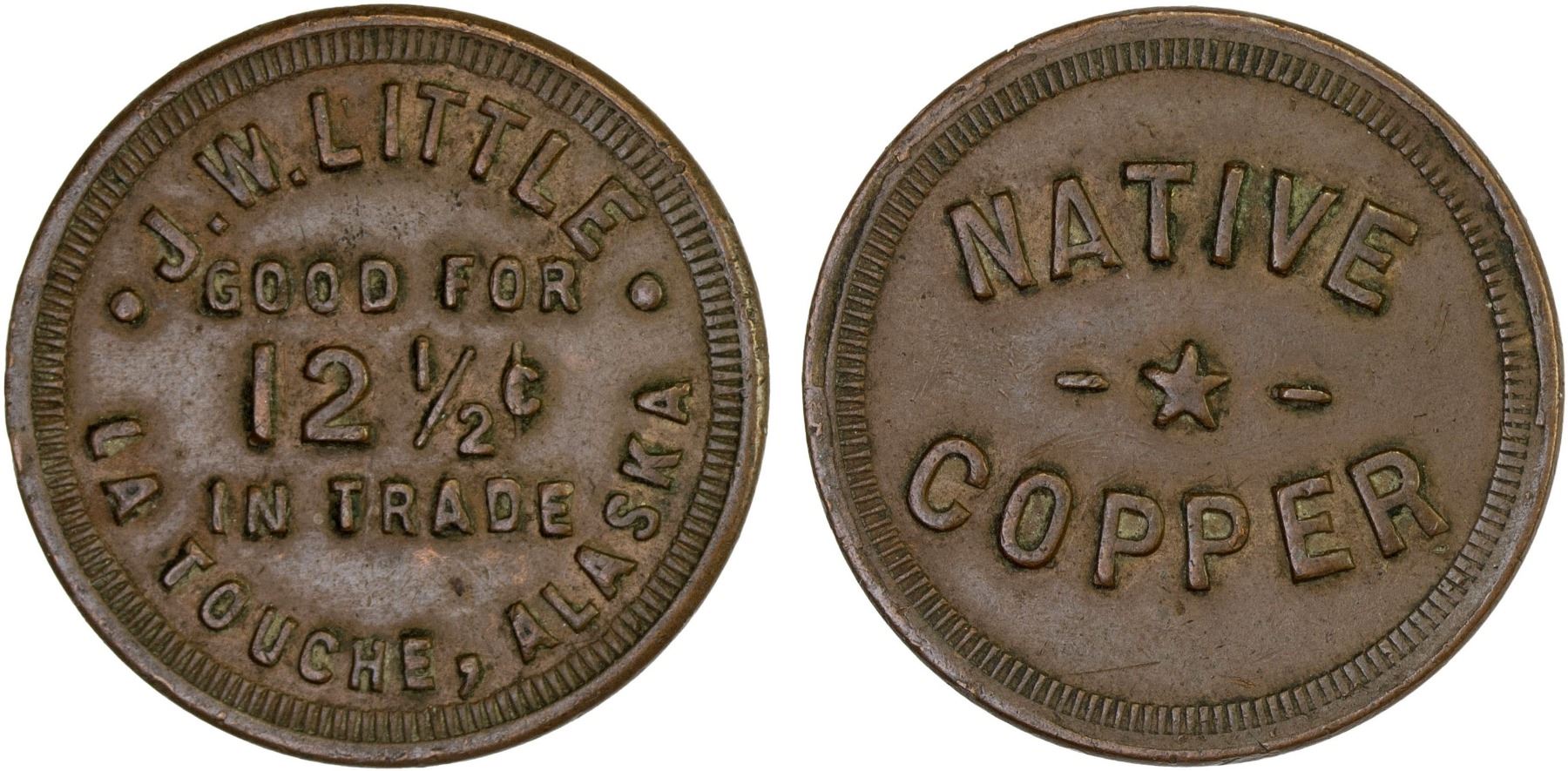 UNITED STATES: AE 12½ cents token, ND (ca. 1908-15), Benice-2A, good-for token for J. W. Little of Latouche, Alaska, NATIVE / COPPER on reverse, attractive light brown patina, XF-AU. Latouche Island is a small unpopulated island in the Prince William Sound in the Gulf of Alaska. It was settled in the late 19th century with the discovery of copper and, at its height, had a population of almost 4000 people.