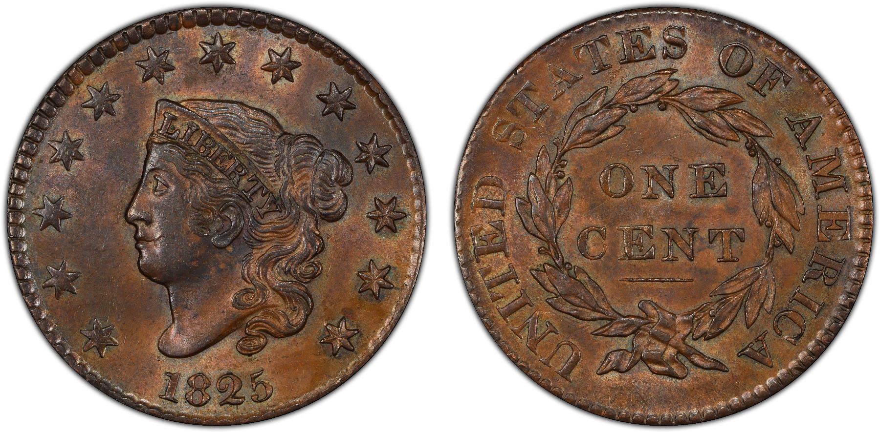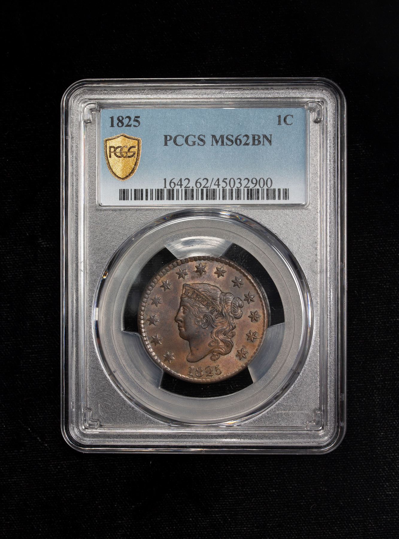 UNITED STATES: AE cent, 1825, Coronet Head type, attractive glossy luster! PCGS graded MS62 BN.