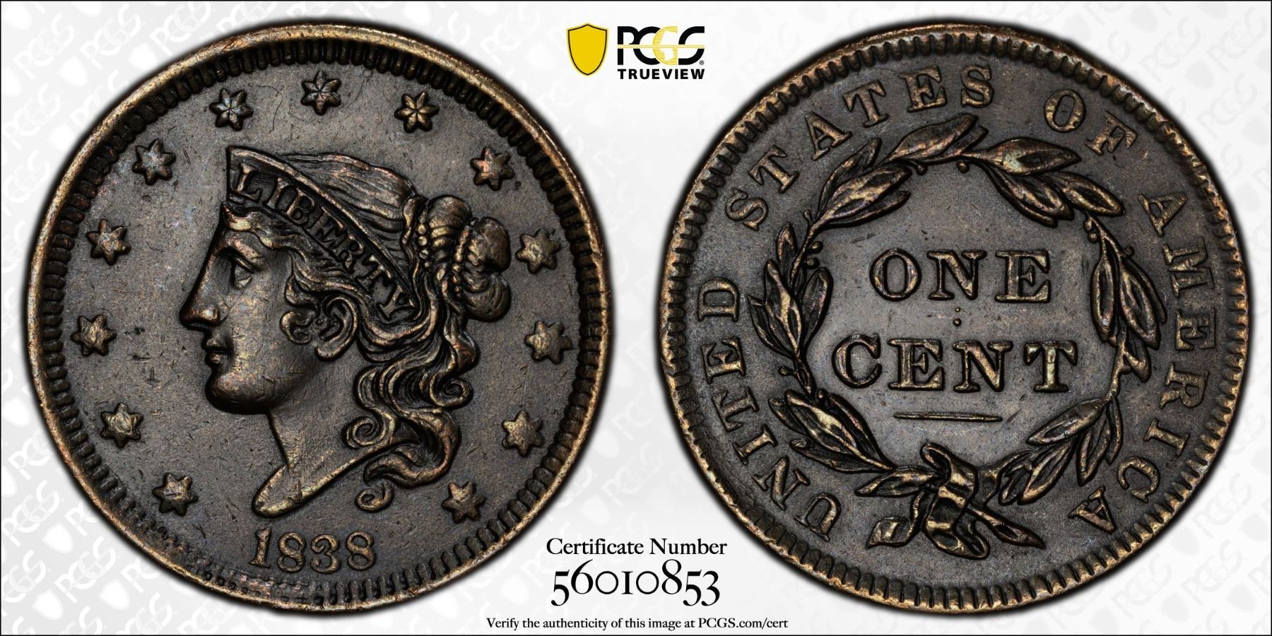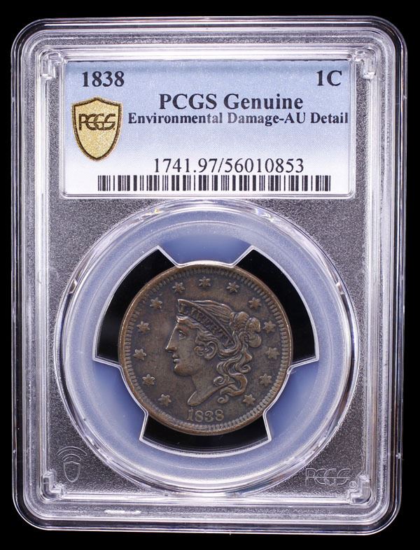 UNITED STATES: AE cent, 1838, KM-45.2, Coronet Head type, environmental damage, PCGS graded AU details, ex Robert A. Rosenfeld Collection.