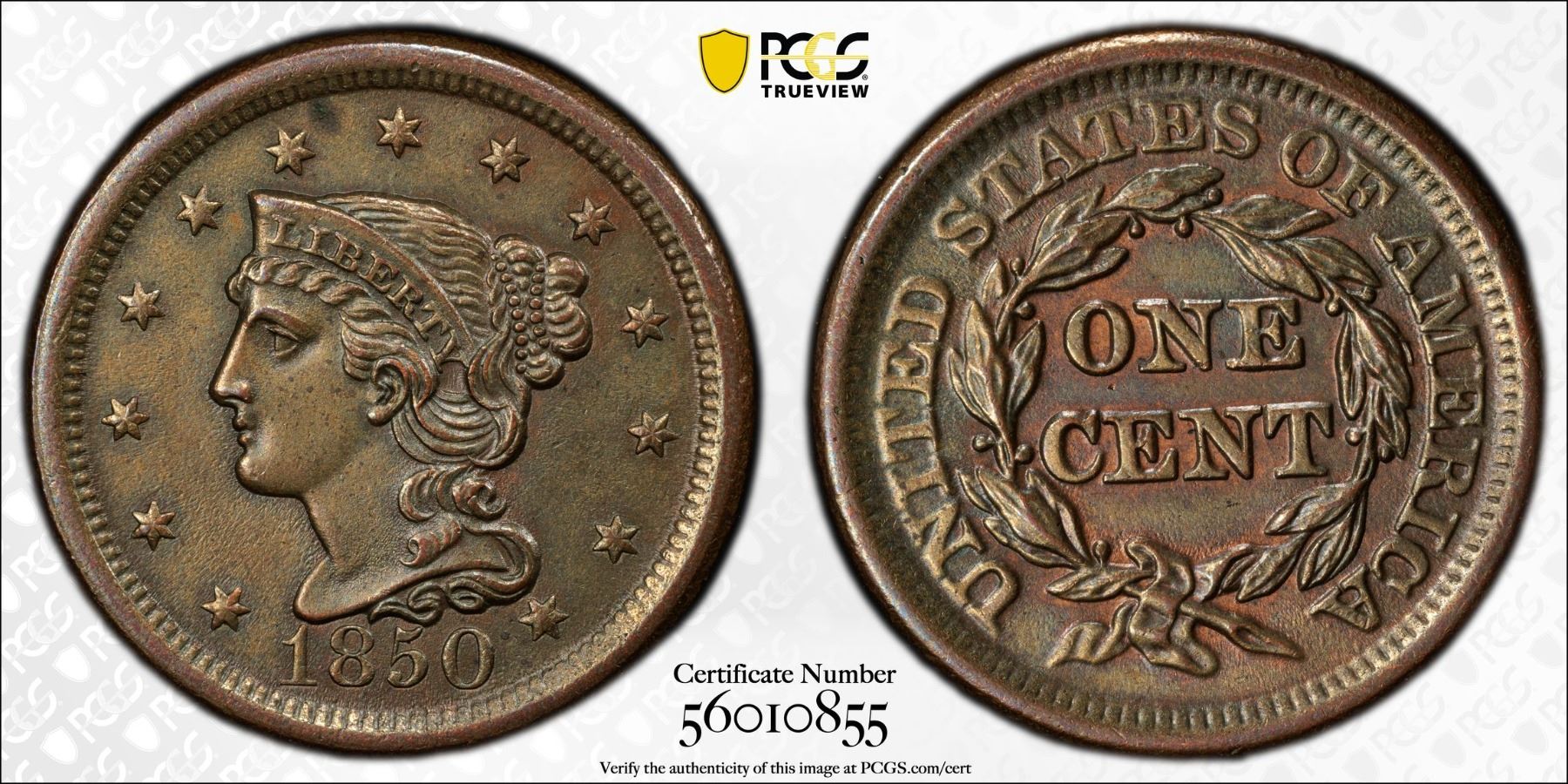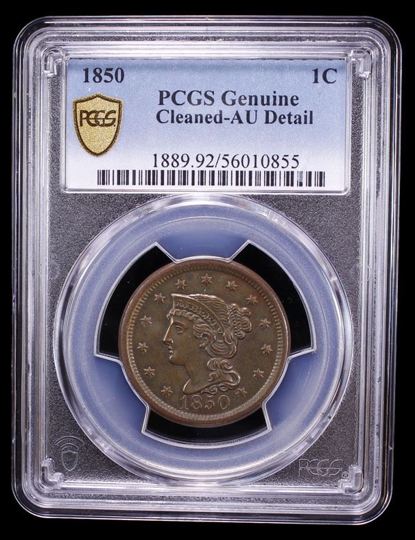 UNITED STATES: AE cent, 1850, KM-67, Braided Hair type, cleaned, PCGS graded AU details, ex Robert A. Rosenfeld Collection.