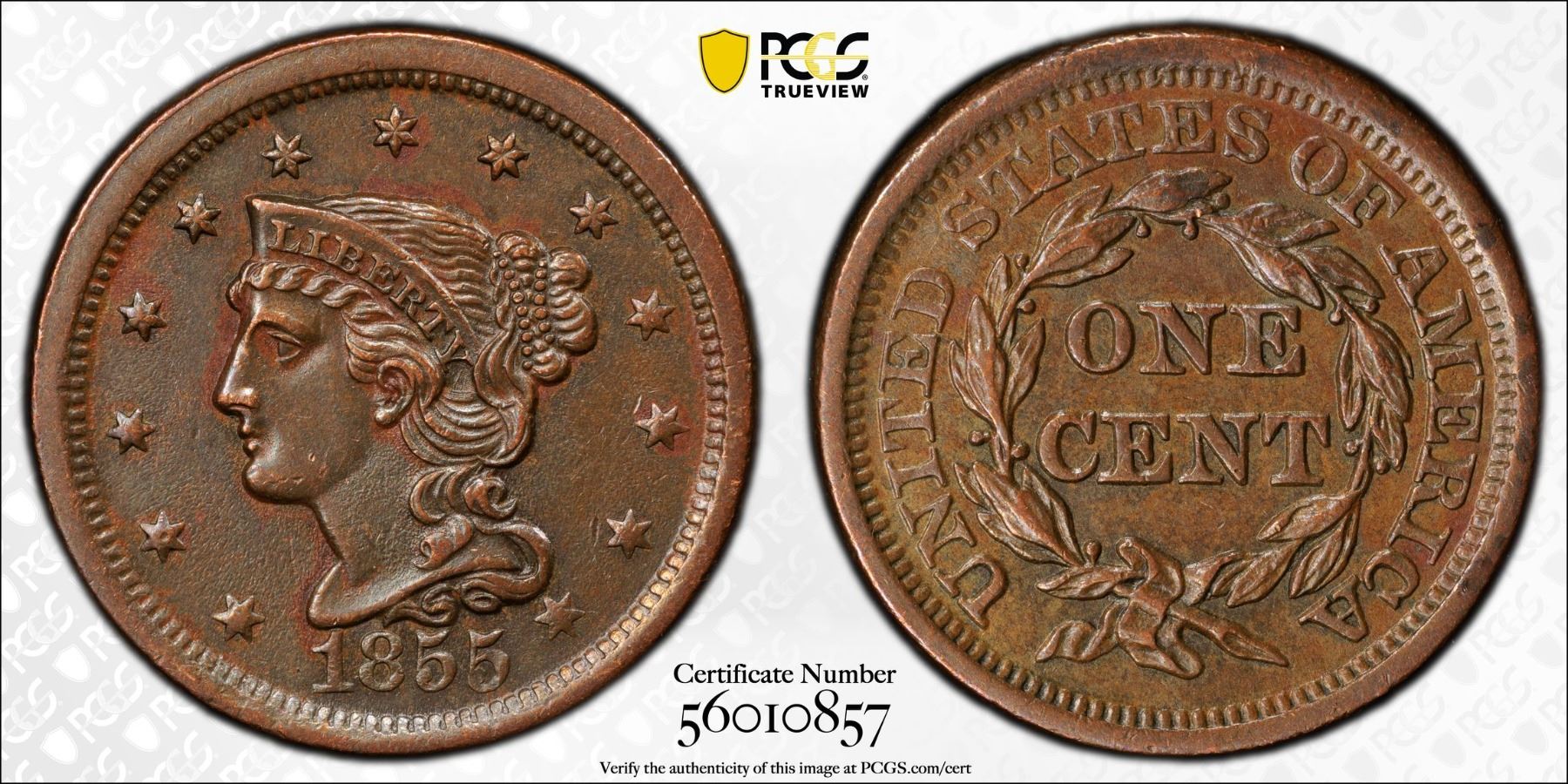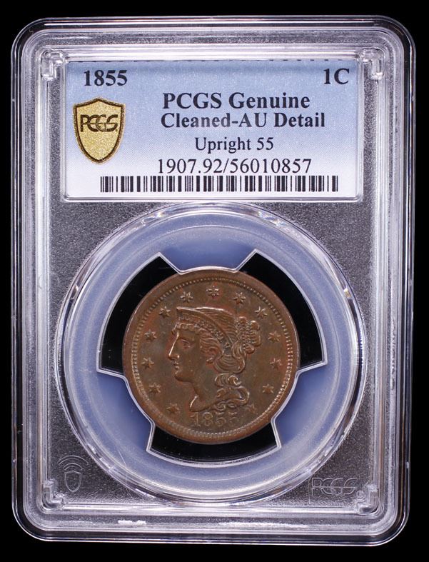 UNITED STATES: AE cent, 1855, KM-67, Braided Hair type, upright 55 variety, cleaned, PCGS graded AU details, ex Robert A. Rosenfeld Collection.