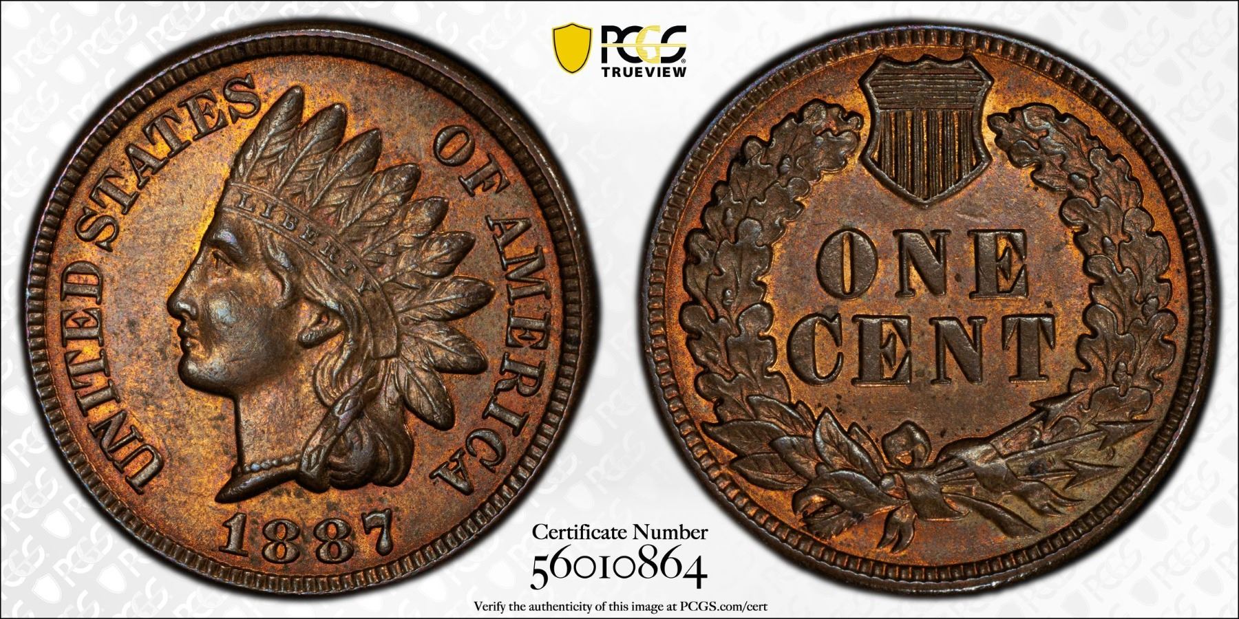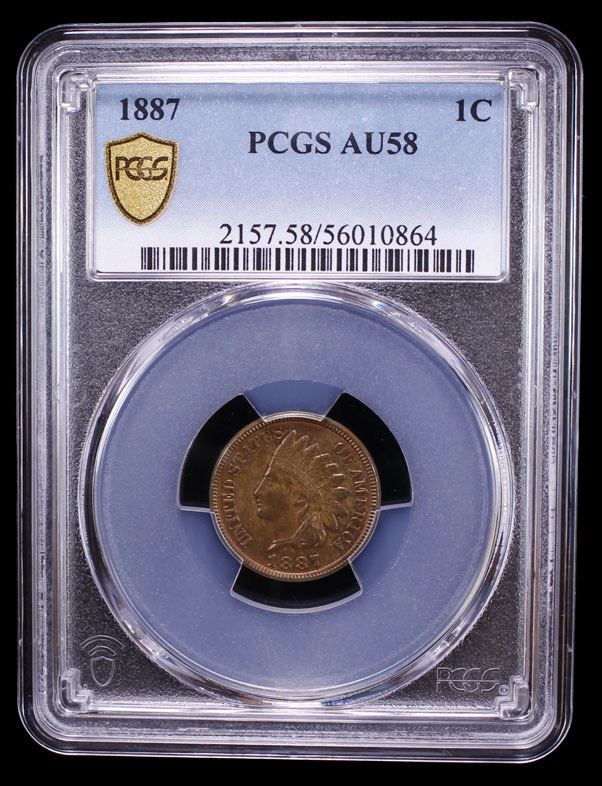 UNITED STATES: AE cent, 1887, KM-90a, Indian Head type, an attractive nearly mint state example, PCGS graded AU58, ex Robert A. Rosenfeld Collection.