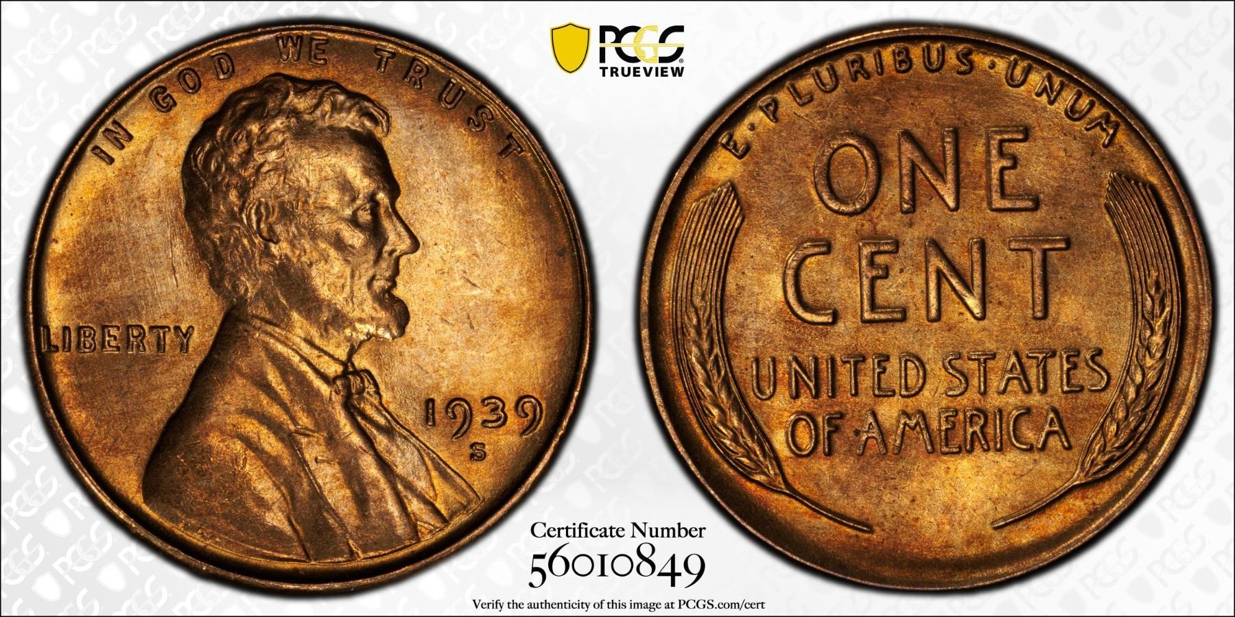 UNITED STATES: AE cent, 1939-S, KM-132, Lincoln type, a superb red lustrous example! PCGS graded MS65 RD.
