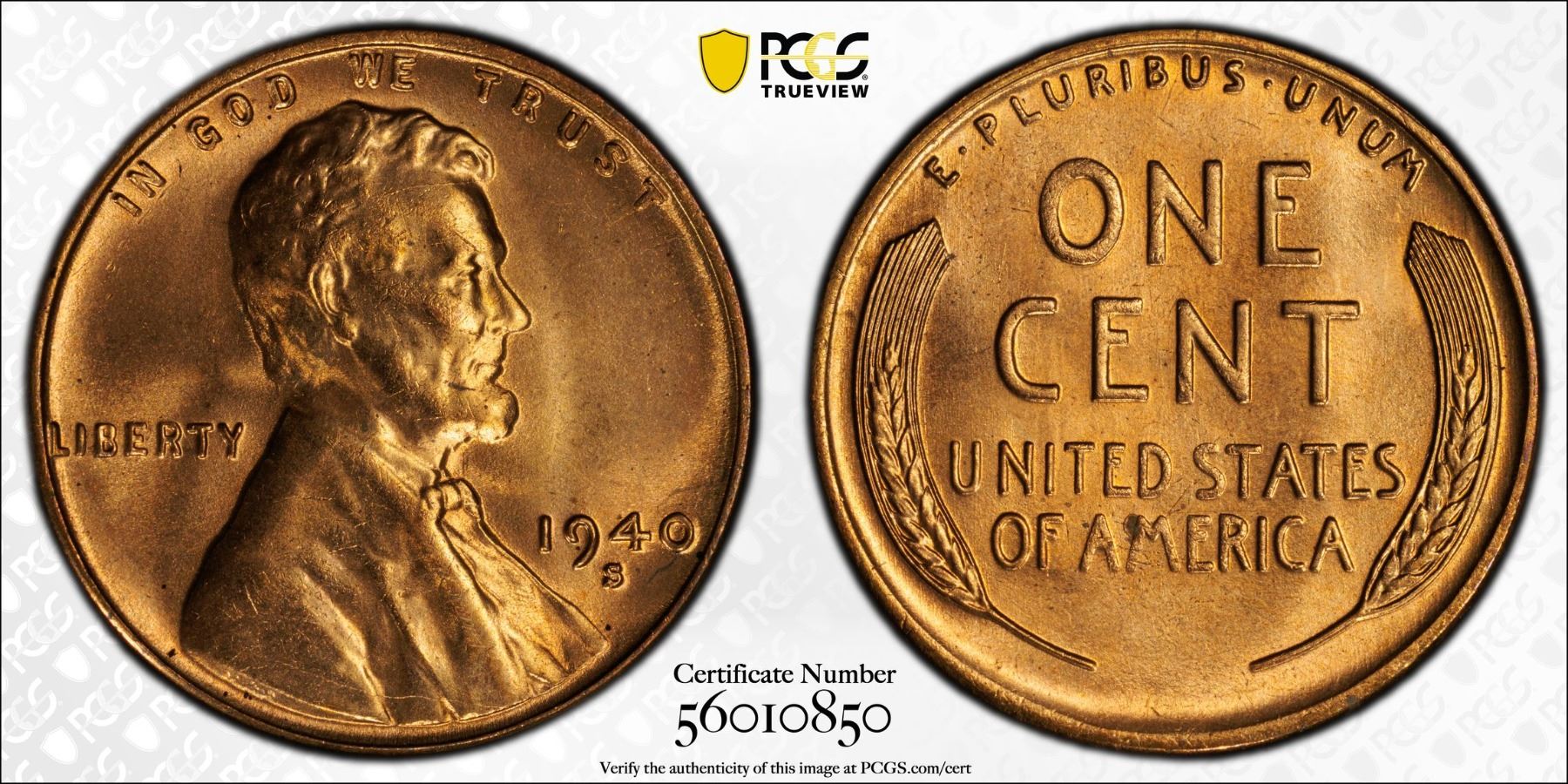 UNITED STATES: AE cent, 1940-S, KM-132, Lincoln type, a superb red lustrous example! PCGS graded MS65 RD.